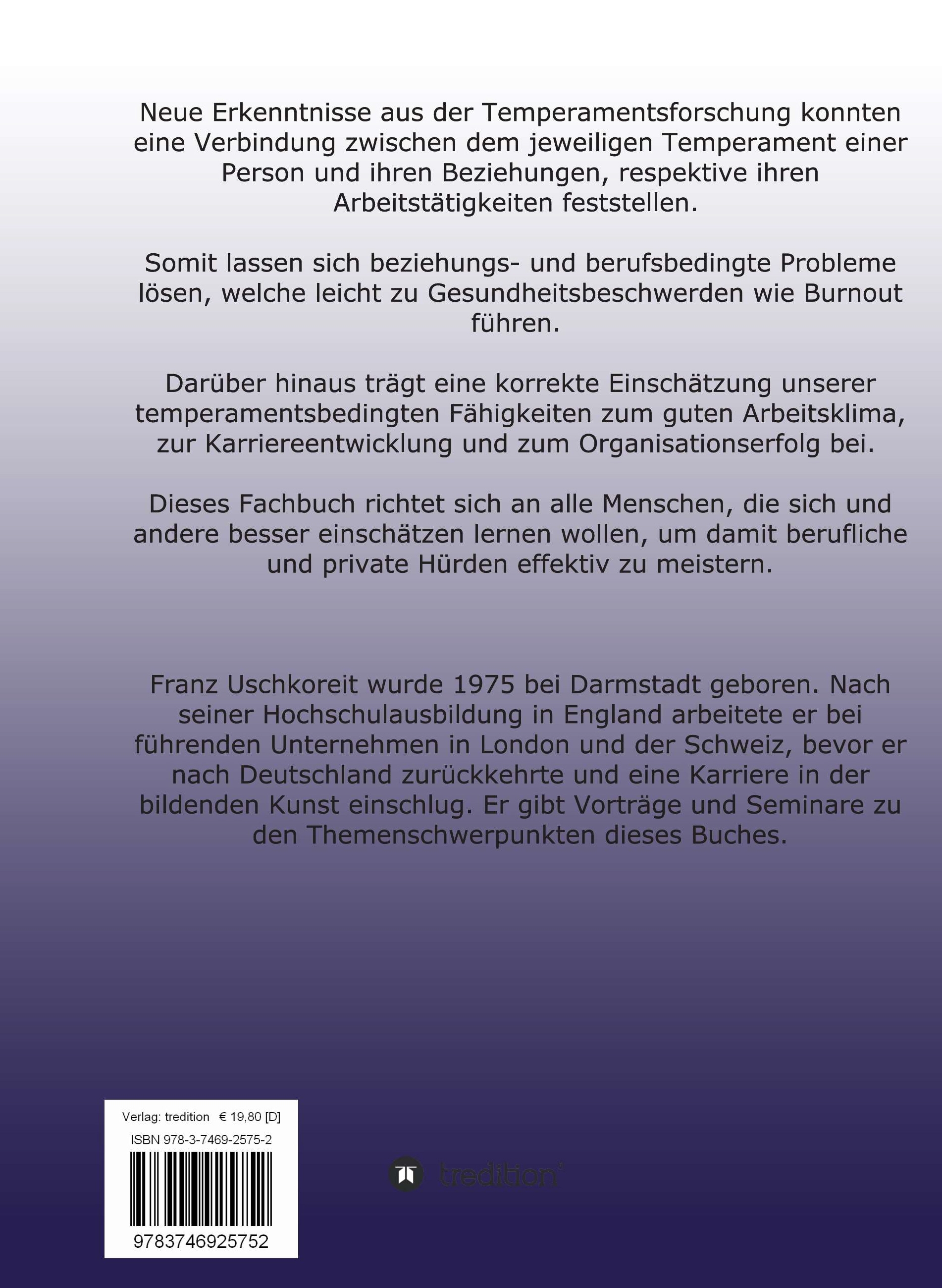 Neue Erkenntnisse aus der Temperamentsforschung konnten eine Verbindung zwischen dem jeweiligen Temperament einer Person und ihren Beziehungen, respektive ihren Arbeitstätigkeiten feststellen. Somit werden beziehungs- und berufsbedingte Probleme vermieden, welche leicht zu Gesundheitsbeschwerden wie Burnout führen. Eine korrekte Einschätzung von Fähigkeiten trägt zum guten Arbeitsklima, zur eigenen Karriereentwicklung und zum Organisationserfolg bei. Das vorliegende Werk richtet sich an alle Menschen, die berufliche und private Hürden effektiv meistern wollen.