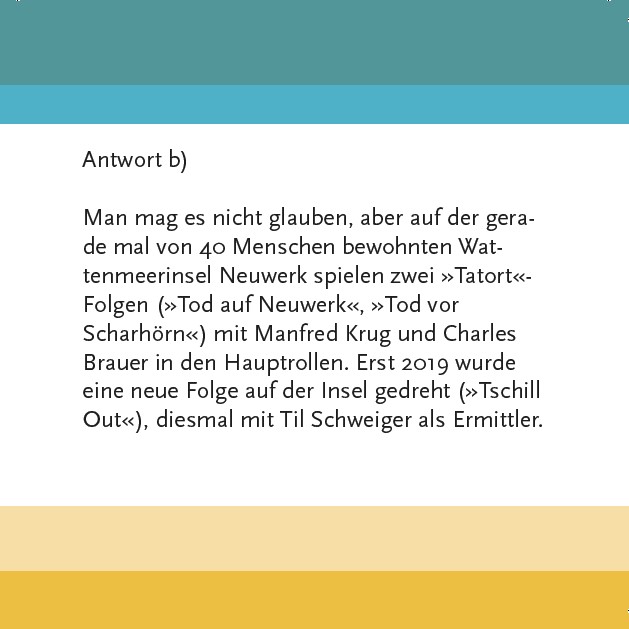 | Schlagworte | 66 fragen • allgemeinbildung quiz • Allgemeinwissen • allgemeinwissen fragen • allgemeinwissen quiz • allgemeinwissen quiz kostenlos • An der Nordseeküste • ars vivendi • ars vivendi verlag • Borkum • Denkspiele • denkspiele für erwachsene • Deutsche Inseln • Deutsche Küste • Deutsche Nordseeküste • Deutsche Ostsee • deutsche ostseeinsel • deutschland meer • deutschland nordsee • die besten wissensspiele • Erwachsenenspiele • Europa • Europäische Union • familienurlaub nordsee • Fehmarn • Frage Antwort • frage antwort spiel • frage antwort spiel lustig • Fragen • fragen quiz • Fragen und Antworten • fragen und antworten quiz • fragen und antworten spiel • Fragespiel • Frage und Antwort • Geschenke • Geschenke für Frauen • Geschenke für Freund • geschenke für freundin • Geschenke für Männer • Geschenk für Freund • Geschenk für Männer • Geschenkideen • Geschenkideen für Männer • geschenkideen männer • Gesellschaftsspiele • gesellschaftsspiele erwachsene • gesellschaftsspiele für erwachsene • gewässer deutschland • Hamburg • Husum • husum deutschland • husum sehenswürdigkeiten • kartenspiele für erwachsene • Kleine Geschenke • kleine weihnachtsgeschenke • knobelspiele für erwachsene • Kreufahrtschiffe • Kreuzfahrten • Küste • Küsten • küsten deutschland • küstenregion deutschland • lustige fragen und antworten • lustige Geschenke • lustige gesellschaftsspiele • lustige Rätsel • meer deutschland • meer in deutschland • Mitbringsel • norden deutschland • Norden Deutschlands • Nordsee • nordsee deutschland • nordsee husum • Nordseeinseln • nordseeinseln deutschland • Nordseeküste • nordseeküste deutschland • Ostsee • ostsee deutschland • Ostseeinsel • Ostseeinseln • Ostseekueste • Ostseeküste • Otto Waalkes • party spiele erwachsene • partyspiele erwachsene • partyspiele für erwachsene • pocket quiz • quiz allgemeinbildung • Quiz Allgemeinwissen • quiz fragen • Quizfragen • quizfragen allgemeinwissen • quizfragen mit antworten • quiz fragen und antworten • quizfragen und antworten • quiz fragen und antworten allgemeinwissen • Quizkarten • quiz kartenspiel • Quizspiel • quiz spiele • Quizspiele • quiz spiele für erwachsene • quizspiele für party • quiz test • Raten • ratequiz für erwachsene • Ratespiel • Rätsel • Rätseln • Rätselspaß • Rätselspiele • Reisespiele • reisespiele für erwachsene • Rostock • seebäder • Spiel des Wissens • spiele für 2 erwachsene • Spiele für Erwachsene • spiele für zwei erwachsene • spiele quiz • spiel erwachsene • Spielkarten • städte an der nordsee • Sylt • Theodor Storm • Überlegen • unterhaltsame Fragen • Unterhaltung • unterhaltung spiel • Unterhaltungsspiele • urlaub deutschland meer • Watt • Weihnachtsgeschenke • Wissensquiz • wissensquiz spiel • Wissensspiele • wissensspiele erwachsene • wissensspiele für erwachsene • Wissenswertes • witzige Geschenke |