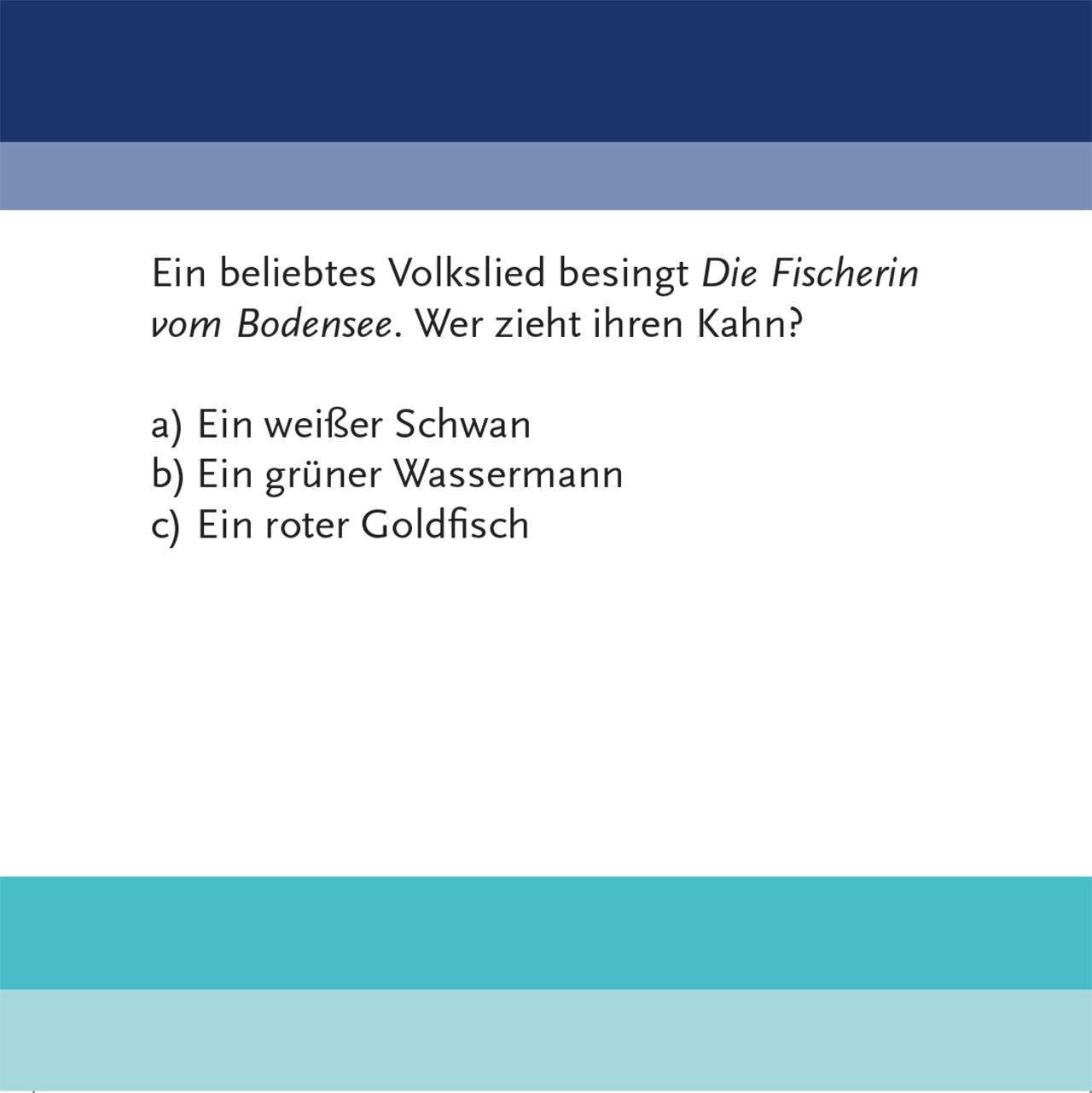 lt;p>Über den Frühling Bikini- bzw. Badehosen-Figur antrainiert, dem Urlaubsplan, sich zu bräunen und im Bodensee zu schwimmen steht nichts mehr im Weg, und platsch, das war der Ehering. Wenn das an der tiefsten Stelle passiert und Sie hinterherspringen wollen, brauchen Sie definitiv Spezialtaucherausrüstung, denn die Verwendung einer normalen Pressluftflasche wird nur bis 40 Meter empfohlen. Die tiefste Tiefe des Bodensees umfasst definitiv mehr als das Dreifache, nämlich entweder 150, 250 oder 350 Meter. Welche Antwort stimmt, müssen Sie entweder wissen oder erraten, bei dieser sowie 65 weiteren Fragen. Die füllen Bodensee und Umgebung inhaltlich mühelos mit Teufelstisch und Seegfrörne, einem James Bond-Film und einem 100 Kilogramm schweren Wels, einem Tier, das die Ermittlungen in einem Mordfall vorantrieb sowie der schockierenden Nachricht, dass es den Bodensee bereits in 20 000 Jahren nicht mehr geben wird.