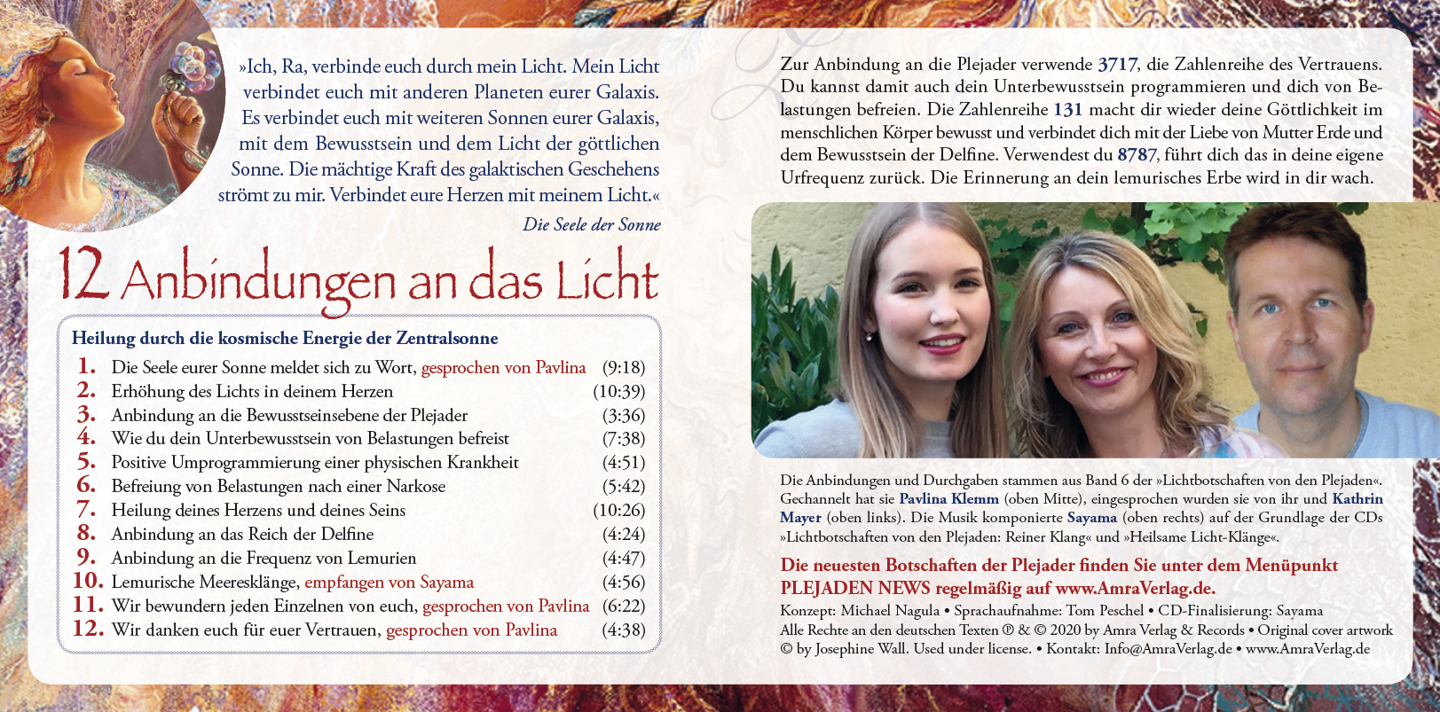 TRACK 3 der CD: Anbindung an die Bewusstseinsebene der Plejader Es gibt eine Möglichkeit, wie du dich telepathisch leichter an uns anbinden kannst. Verwende dazu die Zahlenreihe 3717. Sie wird von uns »Zahlenreihe des Vertrauens« genannt. Mit dieser Zahlenreihe erhältst du direkten Kontakt zum plejadischen Bewusstsein und zu unserer Zivilisation. Sie verbindet dich mit unserer Bewusstseinsebene, unserem Wissen und unserer Frequenz. Die Zahlenreihe 3717 lässt dich spirituell wachsen. Sie stellt einen zum Plejadengestirn und zur plejadischen Zivilisation führenden direkten Zugang und ein Einstiegstor in die Raumzeit dar. Sie ist mit der plejadischen Liebe, Energie und dem plejadischen Schutz aufgeladen. Wenn du sie verwendest, wirst du fühlen, dass gewisse Informationen schneller und gezielter zu dir kommen. Die Zahlenreihe 3717 ist besonders hilfreich, wenn du sie im Kollektiv einsetzt. Deine jetzige Zeit bringt eine verstärkte Form der Kommunikation im Kollektiv mit sich. Die Arbeit im Kollektiv erhöht die Frequenz und erleichtert die Anbindung an Dimensionen, die zur Heilung notwendig sind. Durch das kollektive energetische Wirken formt sich die vervielfachte Energie zu einer Spirale und öffnet und berührt durch ihre Anwesenheit mehrere Dimensionen, Räume und Zeiten gleichzeitig. Wenn du die Zahlenreihe 3717 mit anderen Menschen zusammen laut aussprichst, eröffnen sich euch ungeahnte Möglichkeiten des Heilens sowie Möglichkeiten zur telepathischen wie auch zur visuellen Kommunikation. Du kannst die Zahlenreihe 3717 auch zu deiner persönlichen Heilung verwenden, etwa zur Umprogrammierung deines Unterbewusstseins. TRACK 11 der CD Wir danken euch für euer Vertrauen Wir beobachten, was sich gerade auf diesem Planeten abspielt, all das lichtvolle und physische Geschehen, und es macht uns glücklich zu sehen, wie viele Wesen sich diesem »Spiel« um den Sieg und die Freiheit angeschlossen haben. Wie viele Lichtwesen in dieser Zeit auf den Planeten Erde hinabgestiegen sind und die unterschiedlichsten Frequenzen zur Heilung der gesamten menschlichen Gemeinschaft übertragen. So viele Möglichkeiten bietet euch die göttliche Intelligenz an, damit jeder Mensch die geeigneten Wege oder Techniken findet, die zu seinem Verständnis passen. Wie erfinderisch die Lichtwelt doch ist, damit die menschliche Zivilisation zu ihrer Reinheit und ihrem reinen und klaren Denken zurückkehrt. Es ist wunderschön zu beobachten, wie vielen Menschen die Heilung ihrer Existenz bereits gelungen ist. Wie vielen Menschen es dank der Hilfe der Lichtwelt gelungen ist, das Glück in ihrem Herzen zu finden. Es macht uns glücklich, all dieses herzöffnende Geschehen zu beobachten. Es macht uns glücklich, euch zu helfen und euch Informationen zu übergeben. Wir sind sehr dankbar dafür, dass wir euch begleiten dürfen. Wir danken euch für euren Fleiß, eure Geduld und euer Vertrauen. Wir danken euch, dass ihr durch diese Texte mit uns kommuniziert und mit uns frequenzielle Impuse und verschiedenste Informationen austauscht. Eure Gedanken- und Bewusstseinsfelder verbinden euch mit uns. Aber vor allem verbindet uns die Liebe, die von euren Herzen ausgeht, sie verbindet uns mit euch und macht uns glücklich. Danke, dass ihr da seid. Danke, dass es euch gibt. In diesem menschlichen Körper und in dieser Existenz. Danke, dass ihr Teil des göttlichen Plans seid, der gerade auf diesem Planeten abläuft. Danke, dass der göttliche Plan dank euch auf diesem Planeten stattfinden kann. Jeder Einzelne von euch ist wichtig. Jeder Einzelne. Jedes Wesen, jede Existenz. Jedes Leben und jedes Sein. Jede Lebensform strebt auf ihre Vollkommenheit zu. Auch das menschliche Wesen und sein ganz persönlicher Weg streben auf die Vollkommenheit zu. Wir danken euch allen für eure Hingabe und für eure Hilfe. Für euer Handeln und für euer Verständnis der gesamten Situation. Euer Verständnis bringt Heilung. Heilung auf allen Ebenen der menschlichen Existenz. Frieden mit dir, Frieden mit uns. Die Plejader