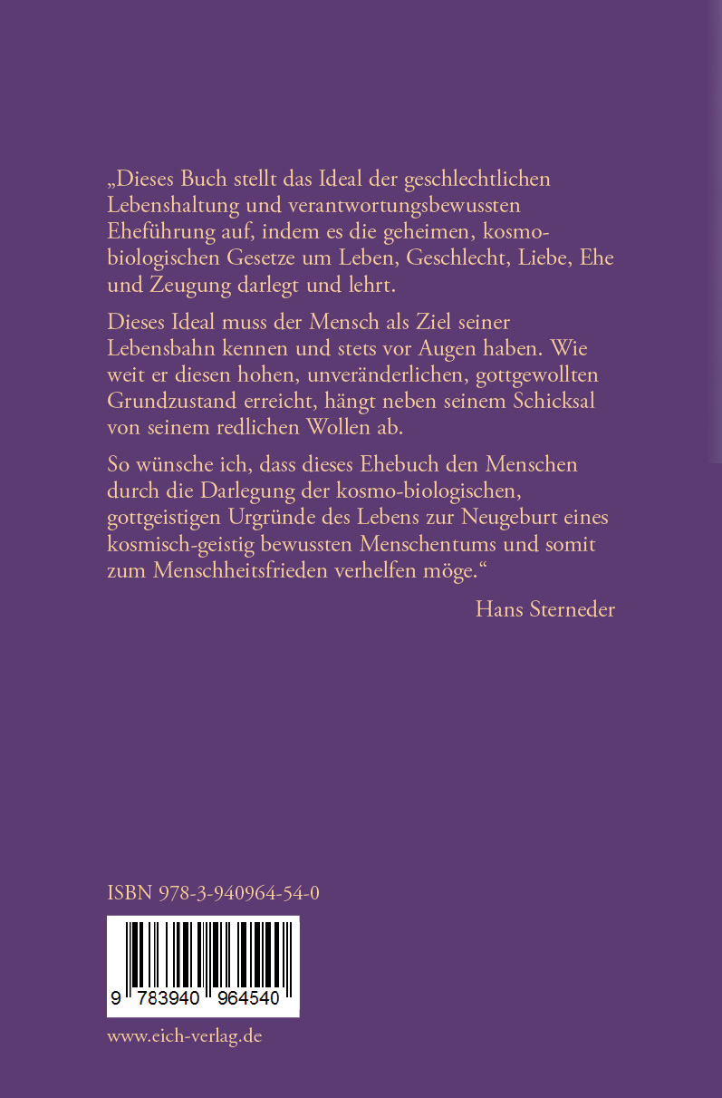 (Aus dem Vorwort:) Dieses Buch stellt das Ideal der geschlechtlichen Lebenshaltung und verantwortungsbewussten Eheführung auf, indem es die geheimen, kosmo-biologischen Gesetze um Leben, Geschlecht, Liebe, Ehe und Zeugung darlegt und lehrt. Dieses Ideal muss der Mensch als Ziel seiner Lebensbahn kennen und stets vor Augen haben. Wie weit er diesen hohen, unveränderlichen, gottgewollten Grundzustand erreicht, hängt neben seinem Schicksal von seinem redlichen Wollen ab. So wünsche ich, dass dieses Ehebuch den Menschen durch die Darlegung der kosmo-biologischen, gottgeistigen Urgründe des Lebens zur Neugeburt eines kosmisch-geistig bewussten Menschentums und somit zum Menschheitsfrieden verhelfen möge.