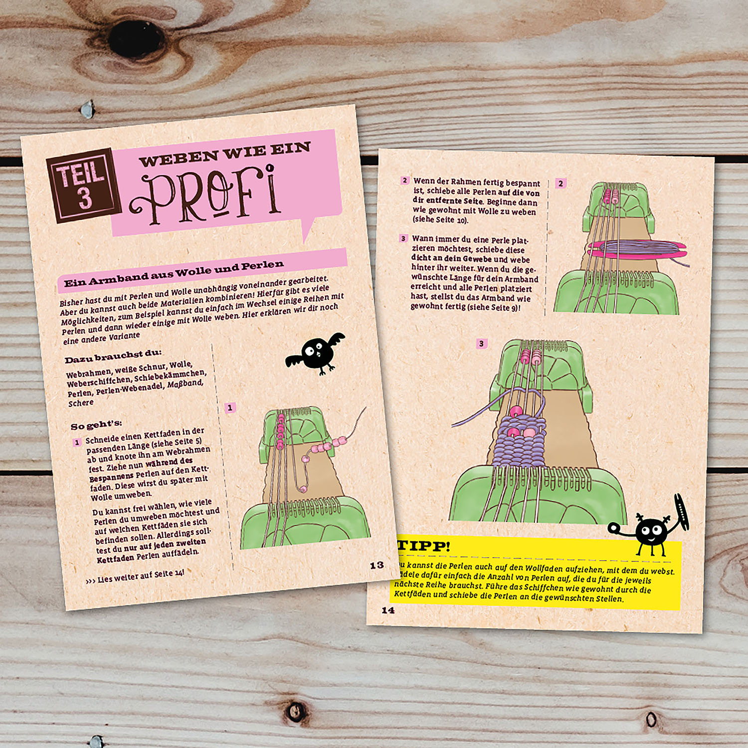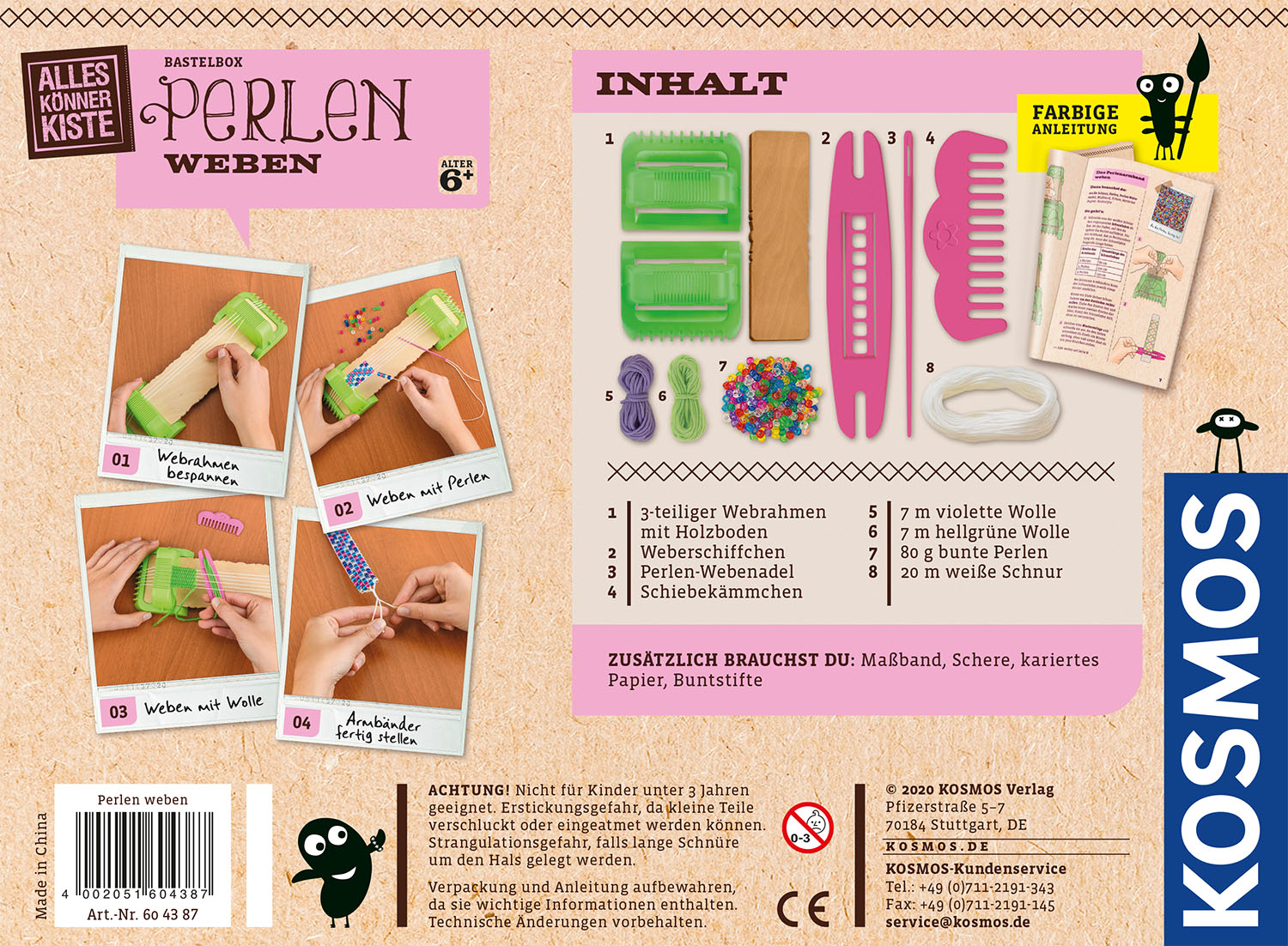 Perlen-Weben: einfach genial! Coole Armbänder, gewebt mit Perlen oder Wolle: mit dem „2-in-1-Perlenwebrahmen“ Kinder ab 6 Jahren zu Designern. Einfach der anschaulichen Anleitung folgen und den stabilen Webrahmen aus Holz und Kunststoff fix aufbauen. Der Webrahmen lässt sich schnell und einfach bespannen - so kann es sofort losgehen! Das süße Webschiffchen dient gleichzeitig als Halterung für die Musterkärtchen. Die extra-handlichen Perlen lassen sich super easy aufziehen – schneller Erfolg garantiert. Dabei können sich die kleinen Künstler überlegen, ob sie nur mit Wolle, mit Perlen oder mit beidem gleichzeitig weben möchten. Während sie ihrer kreativen Fantasie freien Lauf lassen, schulen sie nebenbei ihre feinmotorischen Fähigkeiten und ihre Geduld. Weben und staunen!