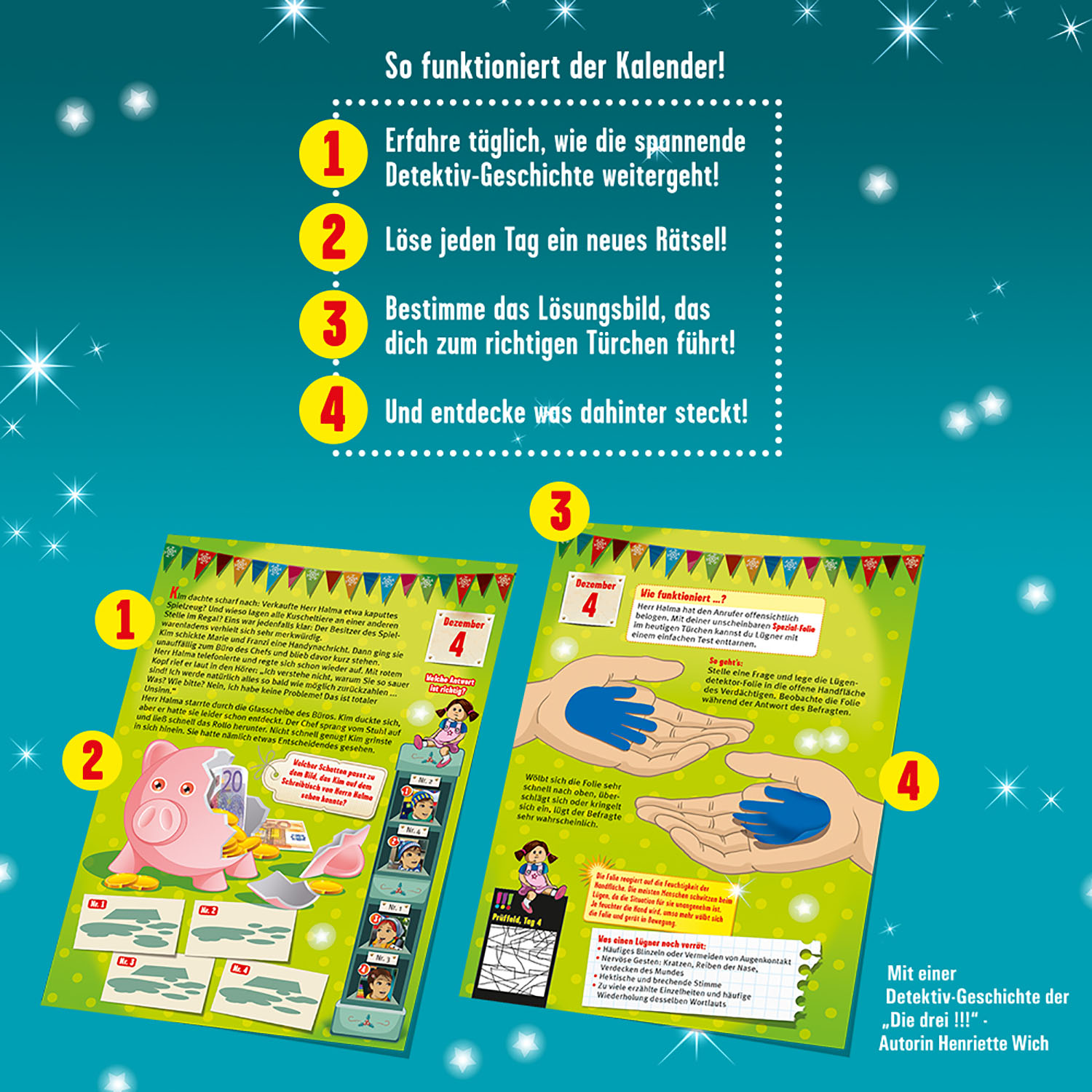Action und Spannung erwarten Kinder ab 8 Jahren mit dem „Die drei !!!- Adventskalender“. 24 Türchen dauert es bis zur Auflösung der aufregenden Detektiv-Geschichte, die sie gemeinsam mit den Heldinnen Franzi, Kim und Marie erleben. Wer steckt hinter den seltsamen Vorfällen im Spielzeugladen, in dem Kim in der Adventszeit jobbt? Wer ist für das Chaos verantwortlich und lässt sogar Teddybären verschwinden? Um das nächste Türchen zu öffnen, müssen Nachwuchsdetektive täglich ein Rätsel lösen und das passende Lösungsbild finden. Zur Belohnung versteckt sich hinter jedem Türchen ein cooles Detektiv-Gimmick. Ein spannendes Abenteuer, das die Zeit bis Weihnachten in Windeseile vergehen lässt.