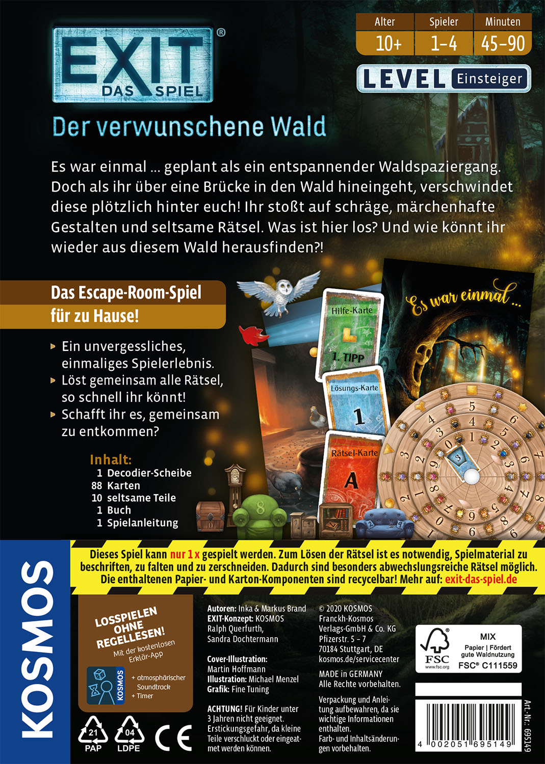 Aus der erfolgreichen Spielereihe "EXIT® - Das Spiel". Das Escape-Room-Spiel für zu Hause. Könnt ihr die Rätsel lösen und dem Wald entkommen? 1-4 SpielerInnen lösen im Team clevere Rätsel und brauchen dazu Teamgeist, Kreativität und Kombinationsgeschick. Kooperatives Erlebnisspiel im Level: Einsteiger. Mit Tutorial und Timer in der kostenlosen KOSMOS-Erklär-App. Mit und ohne App spielbar. Gesellschaftsspiel für Erwachsene, Fans von Live Escape Rooms und Familien ab 10 Jahren. Ideal als Partyspiel, Eventspiel und als Geburtstagsgeschenk. Da die Materialien für die außergewöhnlichen Rätsel verändert werden, nur einmal spielbar! In nur wenigen Minuten von der Wirklichkeit mitten hinein in ein aufregendes Märchen-Abenteuer: Im EXIT® Spiel "Der verwunschene Wald" geht es von einem Moment auf den anderen nicht mehr mit rechten Dingen zu! Die Spielerinnen und Spieler stoßen auf seltsame Märchenwesen, die ihnen ungewöhnliche Rätsel stellen. Nur wenn sie diese gemeinsam lösen, finden sie aus dem Wald wieder heraus. Wie sie am besten vorgehen und welche Hilfsmittel sie dafür einsetzen entscheiden alle gemeinsam im Team. Seite für Seite und Karte um Karte kommen sie den Geheimnissen des mysteriösen Ortes und seiner Bewohner näher. Tolle Rätsel-Erfolgserlebnisse und ein spannendes Setting erwarten euch!Mit der Reihe "EXIT® - Das Spiel" bringt KOSMOS das Gefühl der Live-Escape-Rooms zu euch nach Hause. Jede Box bietet einer Gruppe von 1 bis 4 Personen ein außergewöhnliches Spielerlebnis für einen einmaligen und absolut unvergesslichen Abend! Der Wettlauf gegen die Zeit und die cleveren Rätsel dieser innovativen Spielreihe sorgen für Spannung und geistige Herausforderung in den eigenen vier Wänden. Um die Rätsel zu lösen und sich somit gemeinsam aus der misslichen Lage zu befreien ist Teamgeist gefragt! Also arbeitet gut zusammen, denn die Zeit läuft...Live-Escape-Feeling im Einsteiger-Level.Inhalt: 1 Decodier-Scheibe, 88 Karten, 10 seltsame Teile, 1 Buch, 1 Spielanleitung