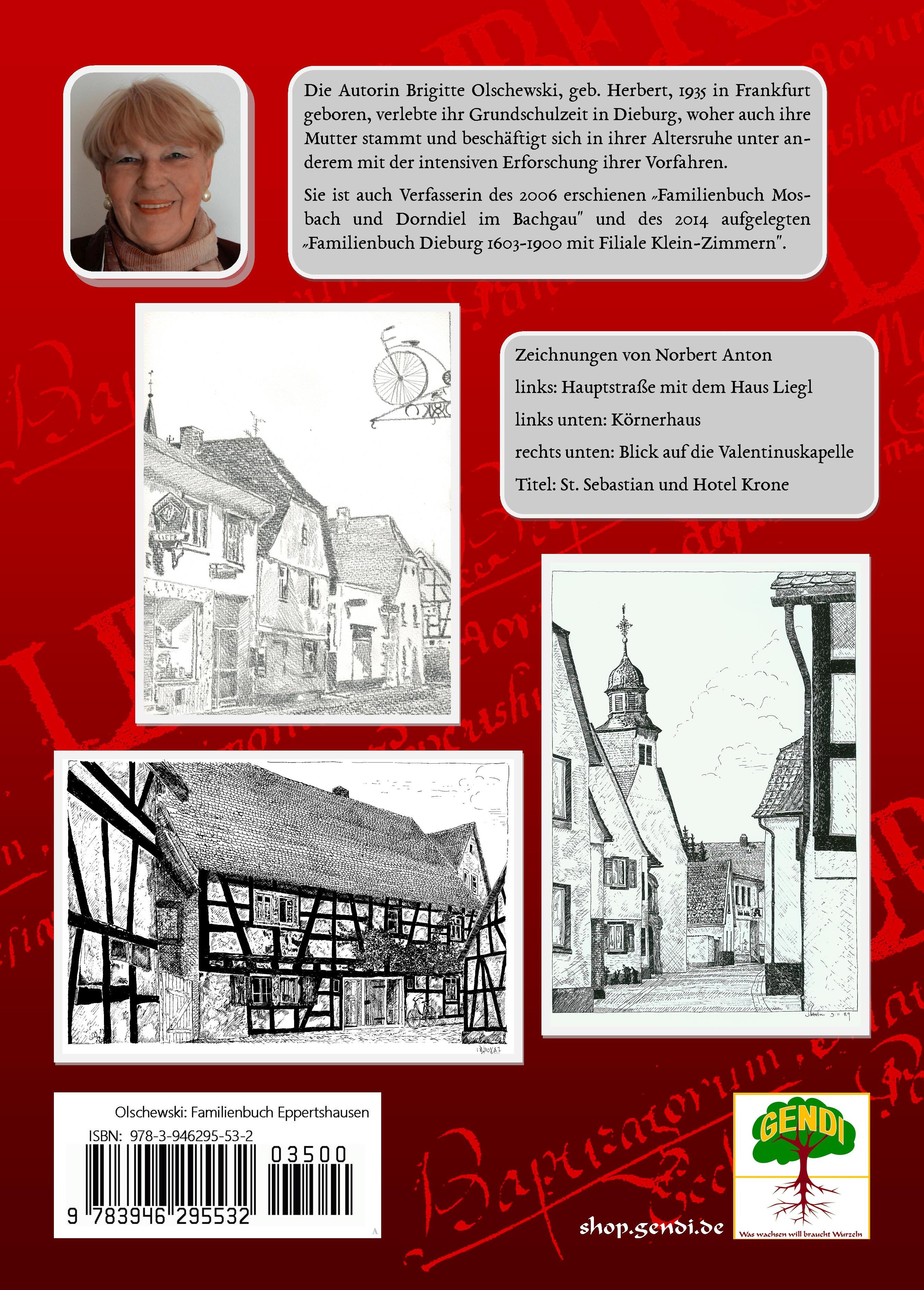 Frau Olschewski legt mit dem Familienbuch Eppertshausen ihr drittes Ortsfamilienbuch vor. Akribisch hat sie über Jahre die Familien von Eppertshausen zusammengestellt und teilweise ihre Schicksale skizziert. Als Quellen dienten die Kirchenbücher von Eppertshausen, Dieburg, Messel und Seligenstadt und die Personenstandsregister und Judenmatrikel von Eppertshausen. Auch zahlreichen Veröffentlichungen und Chroniken wurden ausgewertet, so dass viele Verbindungen in andere Orte und auch die zahlreichen Auswanderungen Aufnahme in das Buch fanden.