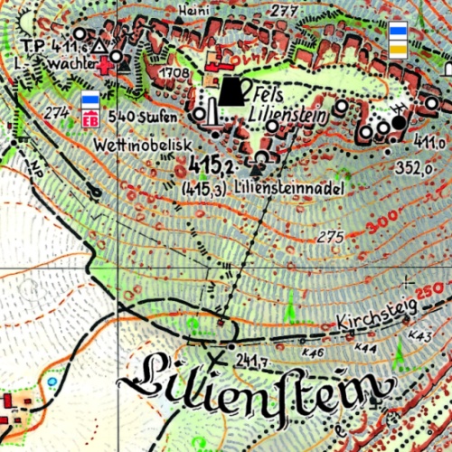 Inhalt: Markierte Wanderwege, nichtmarkierte Wege, Pfade und Klettergipfel. Wirtshäuser, Höhlen, Quellen, Aussichtspunkte etc. weitgehend vollständig. Detaillierte Fels- und Geländedarstellung mit Höhenlinien, Schummerung und Bergstrichen.