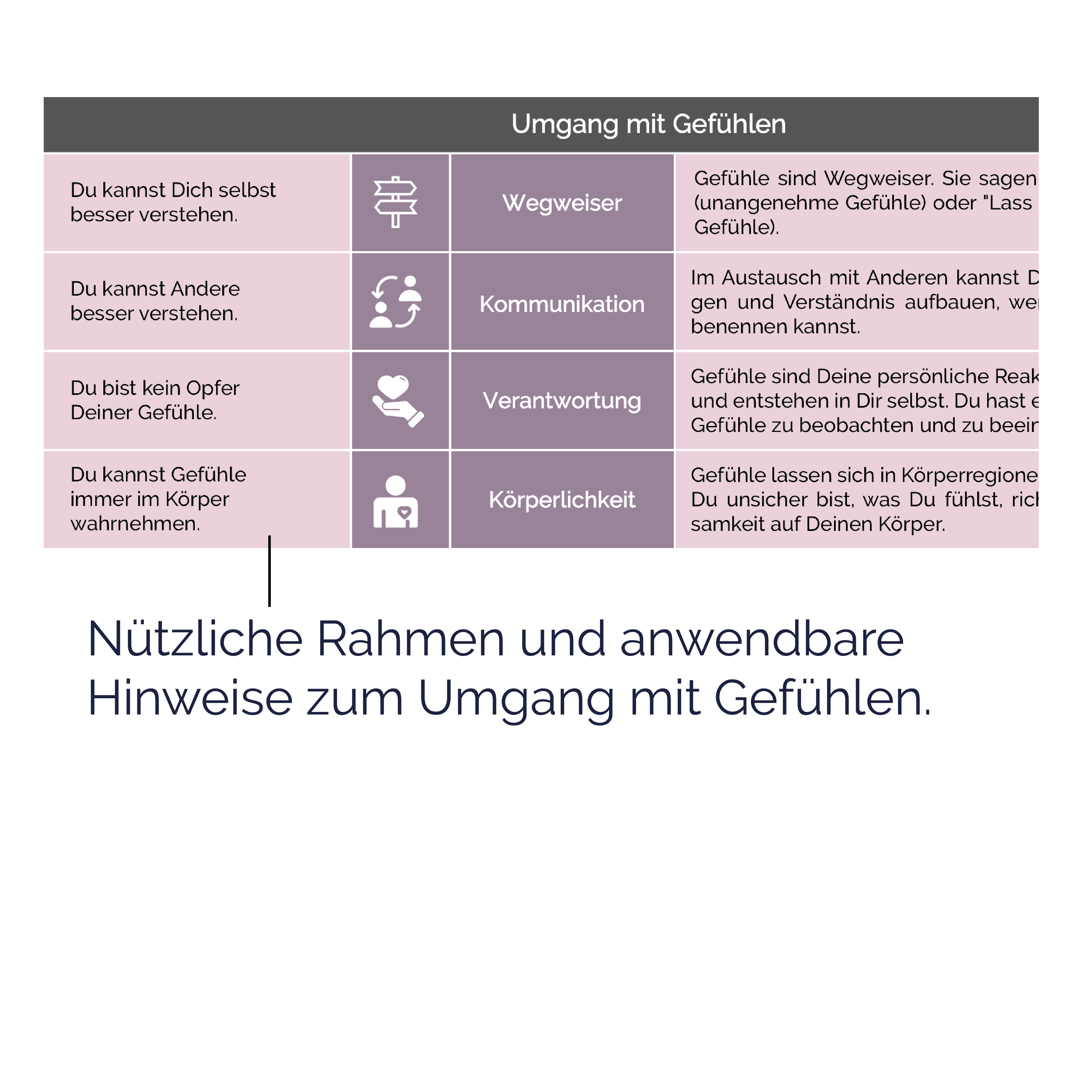 | Schlagworte | Coaching • Emotionale Intelligenz • Gefühle • Gewaltfreie Kommunikation • Seminar • Therapie • Überblick • Workshop • Zusammenfassung |