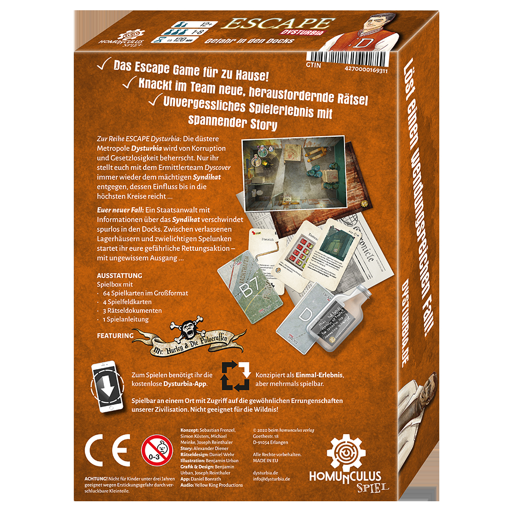 Spielbox mit 64 Spielkarten im Großformat, 4 Spielfeldkarten (21 x 18cm), Rätsel-Dokumenten & Spielanleitung. Spieldauer: ca. 90 Minuten. Empfohlen für 1-8 Personen.