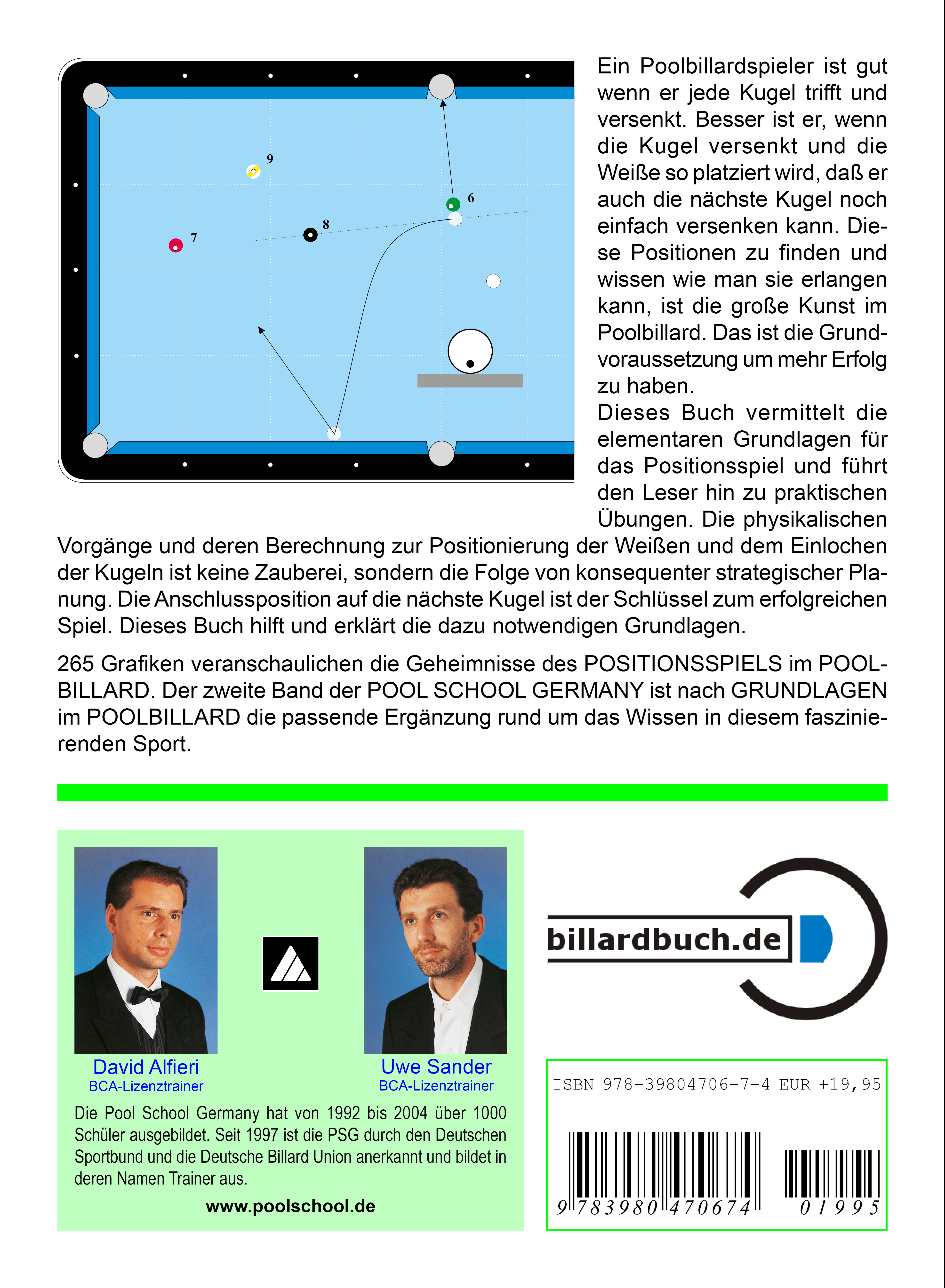 Ein Poolbillardspieler ist gut, wenn er jede Kugel trifft und versenkt. Besser ist er, wenn die Kugel versenkt und die Weiße so platziert wird, dass er auch die nächste Kugel noch versenken kann. Diese Positionen zu finden und zu wissen wie man sie erlangen kann, ist die große Kunst im Poolbillard. Das ist die Grundvoraussetzung, um mehr Erfolg zu haben. Dieser 2. Band vermittelt die elementaren Grundlagen für das Positionsspiel und führt den Leser hin zu praktischen Übungen. Die physikalischen Vorgänge und deren Berechnung zur Positionierung der Weißen und zum Einlochen der Kugeln ist keine Zauberei, sondern die Folge von konsequenter strategischer Planung. Die Anschlussposition auf die nächste Kugel ist der Schlüssel zum erfolgreichen Spiel. Dieses Buch hilft und erklärt die dazu notwendigen Grundlagen. 250 Grafiken veranschaulichen die Geheimnisse des Positionsspiels im Poolbillard. Dieser Band der POOL SCHOOL GERMANY ist nach dem 1. Band "Grundlagen im Poolbillard" die passende Ergänzung rund um das Wissen in diesem faszinierenden Sport.