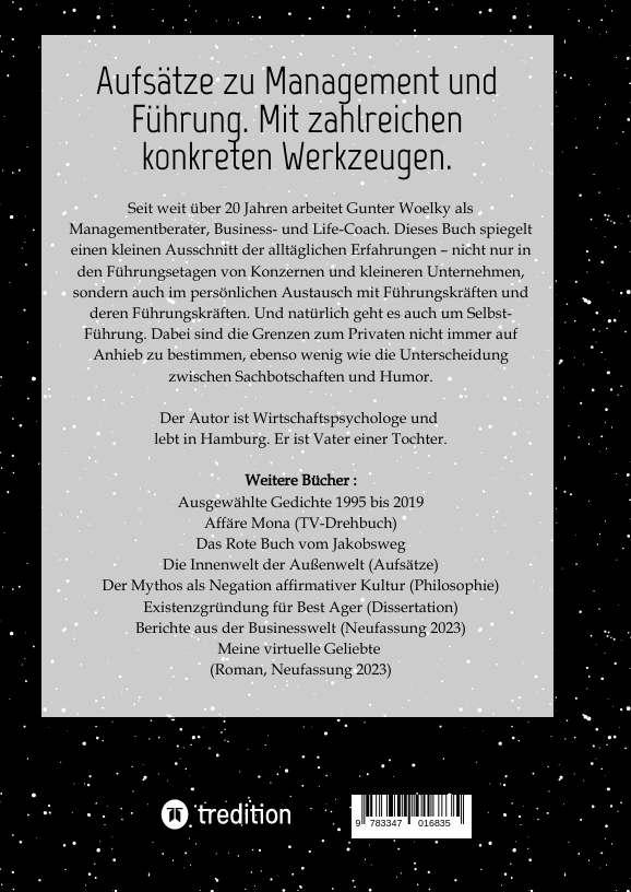Dr. Gunter Woelky lebt in Hamburg, arbeitet als Management-Berater und Business-Coach und ist Vater einer Tochter. Studium: Kommunikations- und Sozialwissenschaften; Kommunikations-Design. Promotion in Wirtschaftspsychologie. Veröffentlichungen ab 2020 Affäre Mona (TV-Drehbuch) Ausgewählte Gedichte 1995 bis 2019 Berichte aus der Businesswelt 2010 bis 2019 (Aufsätze) Das Rote Buch vom Jakobsweg (Tagebuch-Notizen) Die Innenwelt der Außenwelt (Impressionen) Der Mythos als Negation affirmativer Kultur (Philosophie) Existenzgründung für Best Ager (Psychologie; Dissertation) Meine virtuelle Geliebte (Roman; Neufassung 2023)