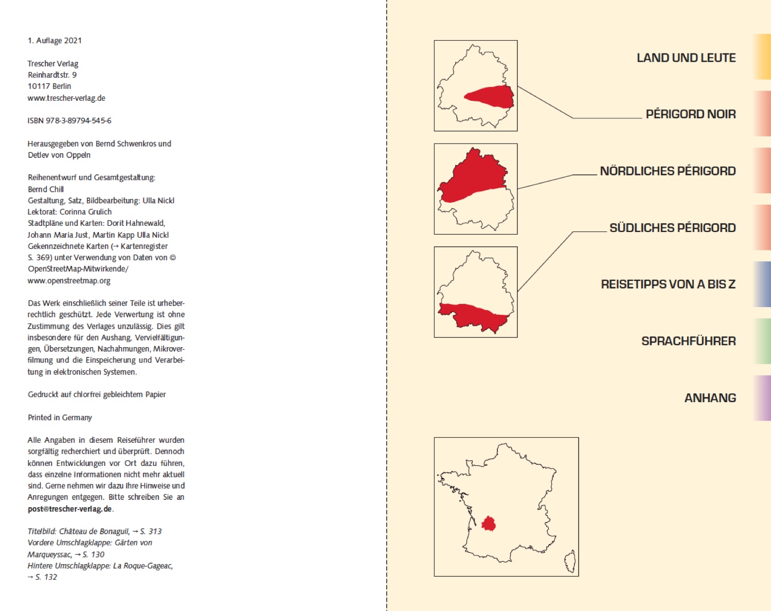 VORWORTVorwort 9Herausragende Sehenswürdigkeiten 10Das Wichtigste in Kürze 12Entfernungstabelle 15LAND _UND_ LEUTE 16Périgord im Überblick 18Geographie 19Aquitanisches Becken 19Flüsse 19Die Causses 21Klima und Reisezeit 23Flora und Fauna 24Geschichte 28Prähistorie 28Zeittafel Ur- und Frühgeschichte 31Gallien 32Frankenreich 34Herzogtum Aquitanien 36Albigenserkreuzzug 41Hundertjähriger Krieg 43Religionskriege 48Absolutismus und Revolution 50Zeittafel Périgord 53Ancien Régime und Kaiserreiche 54Republik Frankreich 55Politik und Wirtschaft 58Wahlen 2017 58Wirtschaft 59Corona-Pandemie 60Sprache, Brauchtum, Religion 63Literatur 63Feste und Brauchtum 64Religion 68Architektur und Kunst 70Romanik 70Gotik 72Häuser im Périgord 74Essen und Trinken 75Kulinarische Genüsse 75Restaurant und Salon du thé 79Wein aus dem Südwesten 83Süßweine 86Apéritifs und Digéstifs 86PÉRIGORD _NOIR 88Sarlat-la-Canéda 91Stadtgeschichte 91Vieux Sarlat 94Kathedrale 101Lanterne des Morts 103Ancien Évêché 103Tal der Dordogne 110Château Fénelon 111Cingle de Montfort 114Domme 119Castelnaud 122Château Les Milandes 123Saint-Cyprien 125Beynac 127Marqueyssac 130La Roque-Gageac 132Carsac-Aillac 135Jardins d'Eyrignac 135Oberes Dordogne-Tal 145Souillac 145Turenne 153Collonges-la-Rouge 156Beaulieu-sur-Dordogne 160Carennac 163Martel 166Lacave 171Tal der Vézère 180Montignac 180Lascaux 184Château de Losse 190Saint-Léon-sur-Vézère 192Le Moustier 193La Madeleine 194Les Eyzies 196Die Umgebung von Les Eyzies 199NÖRDLICHES _PÉRIGORD 216Périgueux 219Stadtgeschichte 219Kathedrale Saint-Front 221Altstadtviertel Saint-Front 225Cité-Viertel 228Musée d'Art et d'Archéologie du Périgord 231Périgord Blanc 239Hautefort 239Sorges 249Antonne-et-Trigonant 249Chancelade 250Tal der Isle 252Forêt de la Double 255Périgord Vert 262Château-l'Évêque 262Bourdeilles 263Brantôme 266Villars 269Saint-Jean-de-Côle 271Mareuil 273SÜDLICHES_ PÉRIGORD 278Bergerac 282Stadtgeschichte 282Altstadt 283Périgord Pourpre 289Vignoble du Bergeracois 289Eymet 296Issigeac 296Pays des Bastides 302Beaumont-du-Périgord 302Belvès 308Monpazier 309Biron 311Château de Bonaguil 313Cadouin 317Limeuil 320REISETIPPS VON A-Z 326SPRACHFÜHRER 334Kulinarischer Sprachführer 342ANHANGGlossar 355Literatur 357Das Périgord im Internet 359Über die Autorin 360Bildnachweis 360Register 361Kartenregister 369Kartenlegende 372Zeichenlegende 372EXTRATrüffel - die schwarzen Diamanten 26Eleonore von Aquitanien - Königin der Troubadoure 38Der Hundertjährige Krieg - Vorgeschichte und Kriegsverlauf 44Troubadoure und Minnesang 62Menu périgourdin 81AOC und das ABC des französischen Weines 87Foie gras 116Eicheln Jupiters - Walnüsse im Périgord 134Die Jakobswege in Frankreich 151Die schönsten Dörfer Frankreichs 159Geburt einer neuen Wissenschaft 188Bertran de Born 247Ein kleiner Pilz macht die Weine groß 294