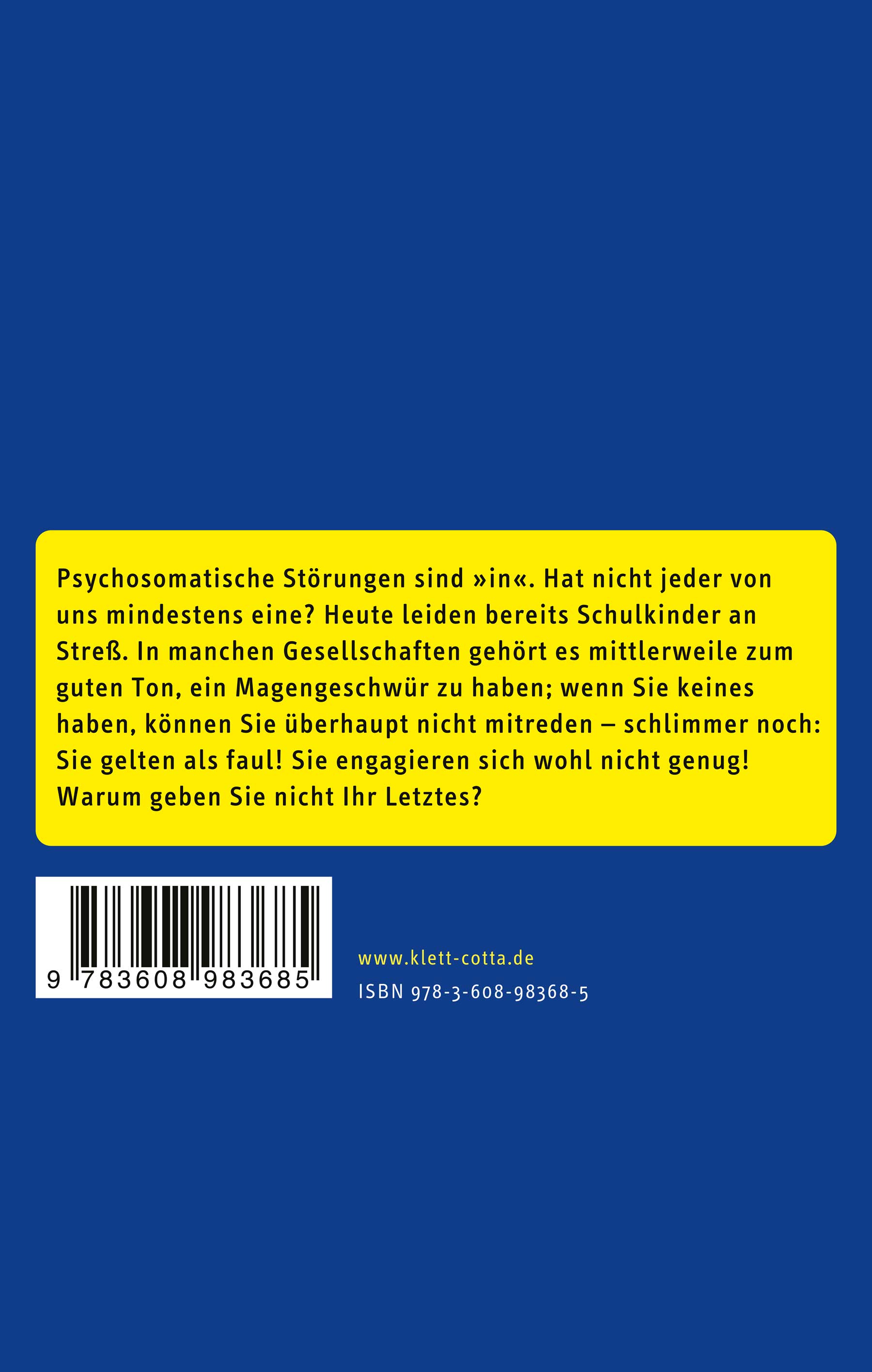 Psychosomatische Störungen sind »in«. Hat nicht jeder von uns mindestens eine? Heute leiden bereits Schulkinder an Streß. In manchen Gesellschaften gehört es mittlerweile zum guten Ton, ein Magengeschwür zu haben; wer keines hat, kann überhaupt nicht mitreden - schlimmer noch: man wird der Faulheit bezichtigt, man engagiere sich nicht genug, lege sich nicht ausreichend ins Zeug, gebe nicht sein Letztes.