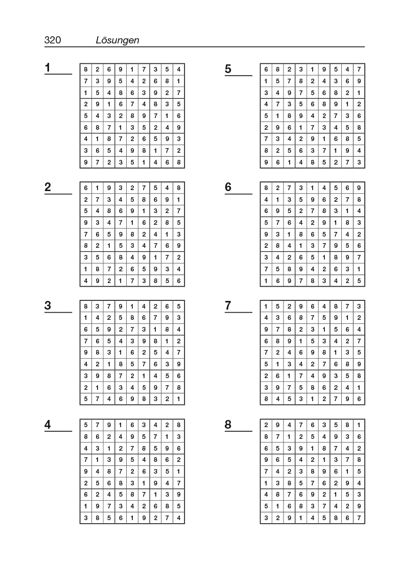 Das aus Japan kommende Rätsel Sudoku besteht aus neun quadratischen 3 x 3-Blöcken, wobei jeder quadratische Block in drei Reihen mit jeweils drei Kästchen unterteilt ist. In jedem quadratischen 3 x 3-Block sind Zahlen zwischen 1 und 9 vorgegeben. Diese vorgegebenen Zahlen gilt es so zu ergänzen, dass jede Zahl zwischen 1 und 9 nur einmal vorkommt. Auch in den neun Spalten und neun Zeilen des gesamten Sudoku Rätsels dürfen die Zahlen von 1 bis 9 nur einmal vor kommen. Die Sudoku-Rätsel sind in die Schwierigkeitsstufen leicht, mittel und schwer und sehr schwer eingeteilt. Jeweils auf der Rückseite finden sich die Lösung zum vorhergehenden Rätsel - für jede Menge Rätselspaß.