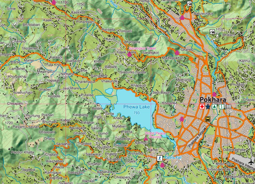 Außerdem zeigt die Karte die wichtigsten Trekkingtouren rund um die Annapurna.