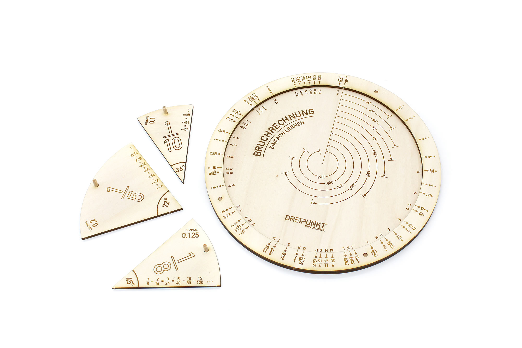 Bruchrechnen leicht gemacht! Bruchrechnungen begegnen uns überall im Alltag. Ob es um das Aufschneiden einer runden Pizza geht oder wir wissen wollen, wie wir am besten eine Großpackung Pralinen unter uns und unseren Freunden aufteilen können. Aber wie war das doch gleich? Wie können Brüche addiert oder subtrahiert werden? Was ist das 'kleinste gemeinsame Vielfache' oder 'größte gemeinsame Teiler'? Mit dem Bruchrechenscheibe und der beiliegenden ausführlichen Anleitung werden alle diese Fragen geklärt und wirklich jeder kann zum Bruchrechen-Experten werden. Bausatz Inhalt - Bruchrechenscheibe (Ring und Grundplatte), alle Teile aus Pappelsperrholz, lasergeschnitten und graviert - Brüche in folgenden Größen: - 1/10 5 Stück - 1/8 5 Stück - 1/6 4 Stück - 1/5 3 Stück - 1/4 2 Stück - 1/3 2 Stück - 1/2 1 Stück - Anleitung (4-seitig, Farbdruck, DIN A4) mit folgenden Themen: - Allgemeines zu Brüchen - Brüche addieren - Brüche erweitern und kürzen - Nutzung der Bruchrechenscheibe - Nutzung der Gradangaben auf der Scheibe - Nutzung der 46 Musteraufgaben Alle Bauteile für die Bruchrechenscheibe sind lasergenau geschnitten und können einfach herausgedrückt werden. Hierfür ist kein Werkzeug erforderlich. Zur besseren Handhabung empfehlen wir die Nutzung der Rundstäbe als Anfasshilfe. Zum Zuschneiden wird ein handelsüblicher Cutter oder ein scharfes Messer benötigt. Bei Problemen beim Zusammenbau steht dir unser Modellbau-Team per eMail unter bauberatung@dreipunkt-verlag.de zur Verfügung.