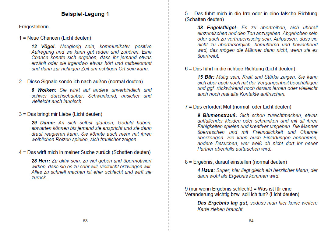 Im zweiten Teil des Buches folgen 8 kleine Legesysteme mit jeweils zwei Deutungsbeispielen.Du ziehst zwischen 6 und 15 Lenormandkarten auf eine bestimmte Situation bzw. Frage und kannst dann hilfreiche Antworten daraus ablesen.