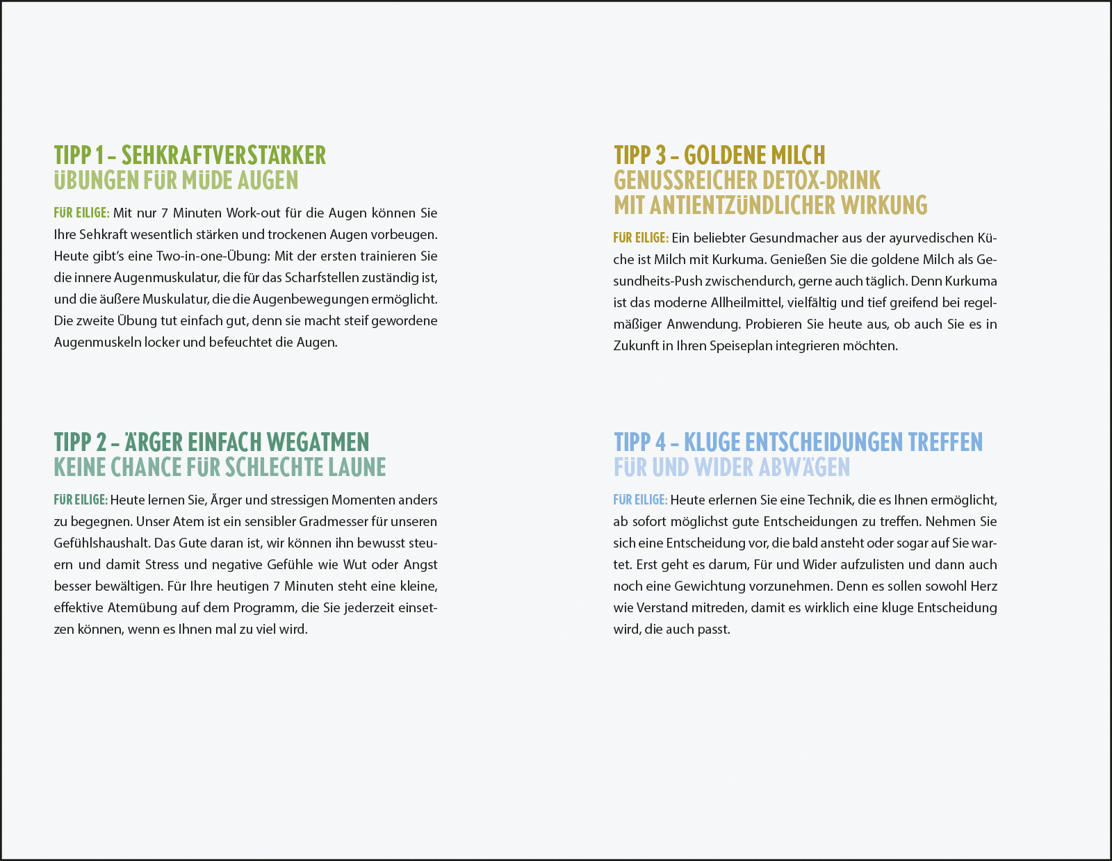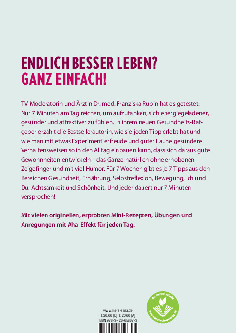 Die Tipps kommen aus den Bereichen: Prävention, Mind-Body-Medizin, soziales Miteinander, Self-Care, Ernährung, Bewegung und Entspannung und Stressmanagement. Mit vielen schnellen Rezepten, Anleitungen, Übungen und Anregungen für eine gesündere Lebensweise. 7 Minuten am Tag hat jeder.