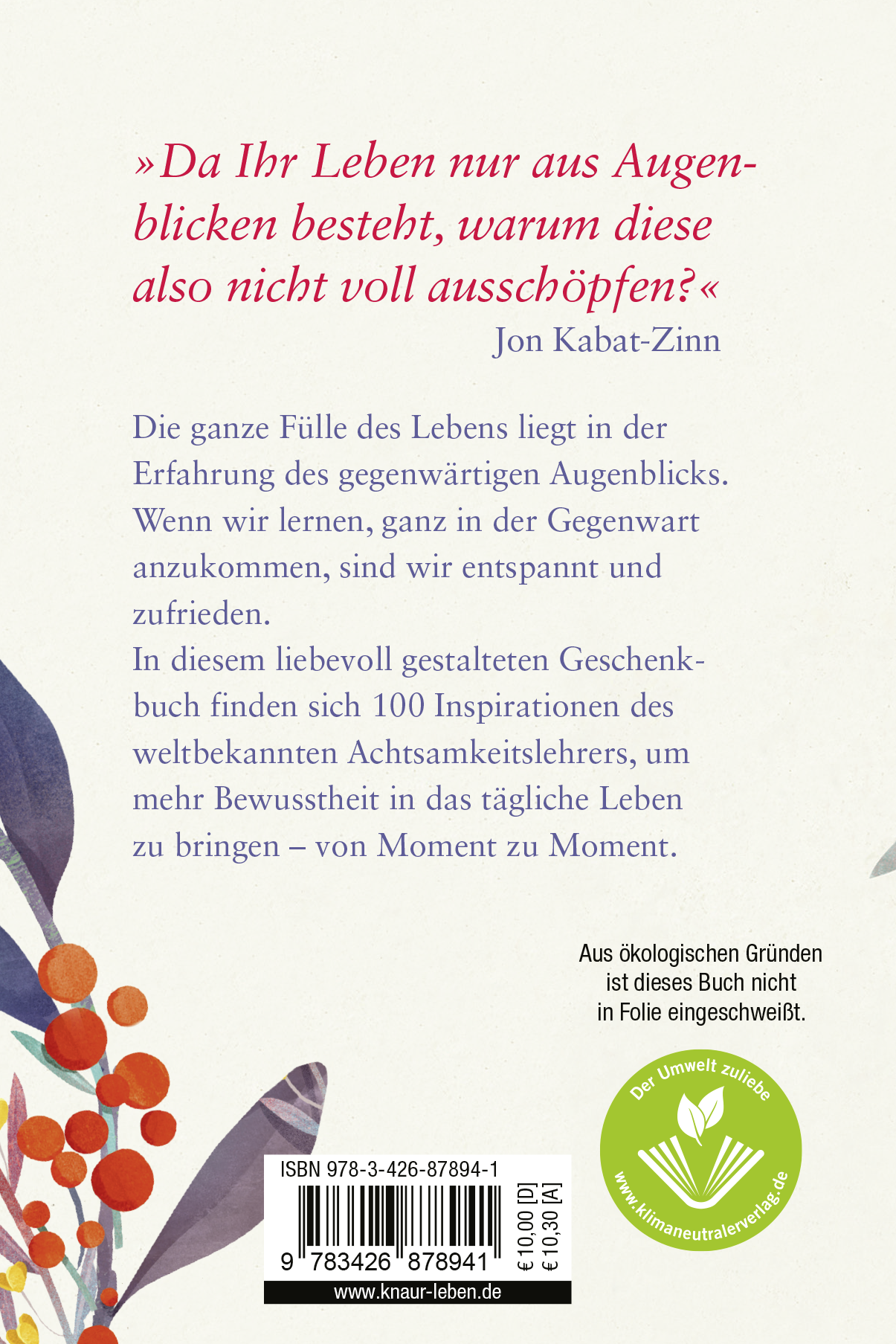 Die ganze Fülle des Lebens liegt in der Erfahrung des gegenwärtigen Augenblicks. Wenn wir mehr und mehr lernen, mit Achtsamkeit ganz in der Gegenwart anzukommen, kommen wir in Kontakt mit dem wahren Glück in uns selbst. Jon Kabat-Zinn schreibt: "Da Ihr Leben nur aus Augenblicken besteht, warum diese also nicht voll ausschöpfen und herausfinden, was es bedeuten kann, Ihrem tiefsten und wahren Wesen immer häufiger treu zu sein?"