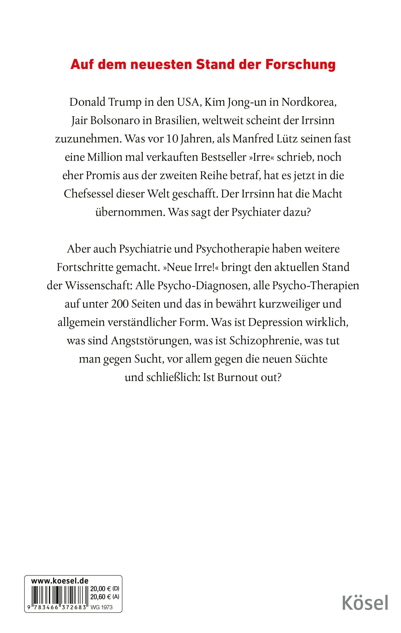 Was ist Depression wirklich, was sind Angststörungen, was ist Schizophrenie, was tut man gegen Sucht, vor allem gegen die neuen Süchte und schließlich: Ist Burnout out? Der renommierte Psychiater und Bestseller-Autor Manfred Lütz bringt Licht ins Dunkel des allgemeinen Wahnsinns.