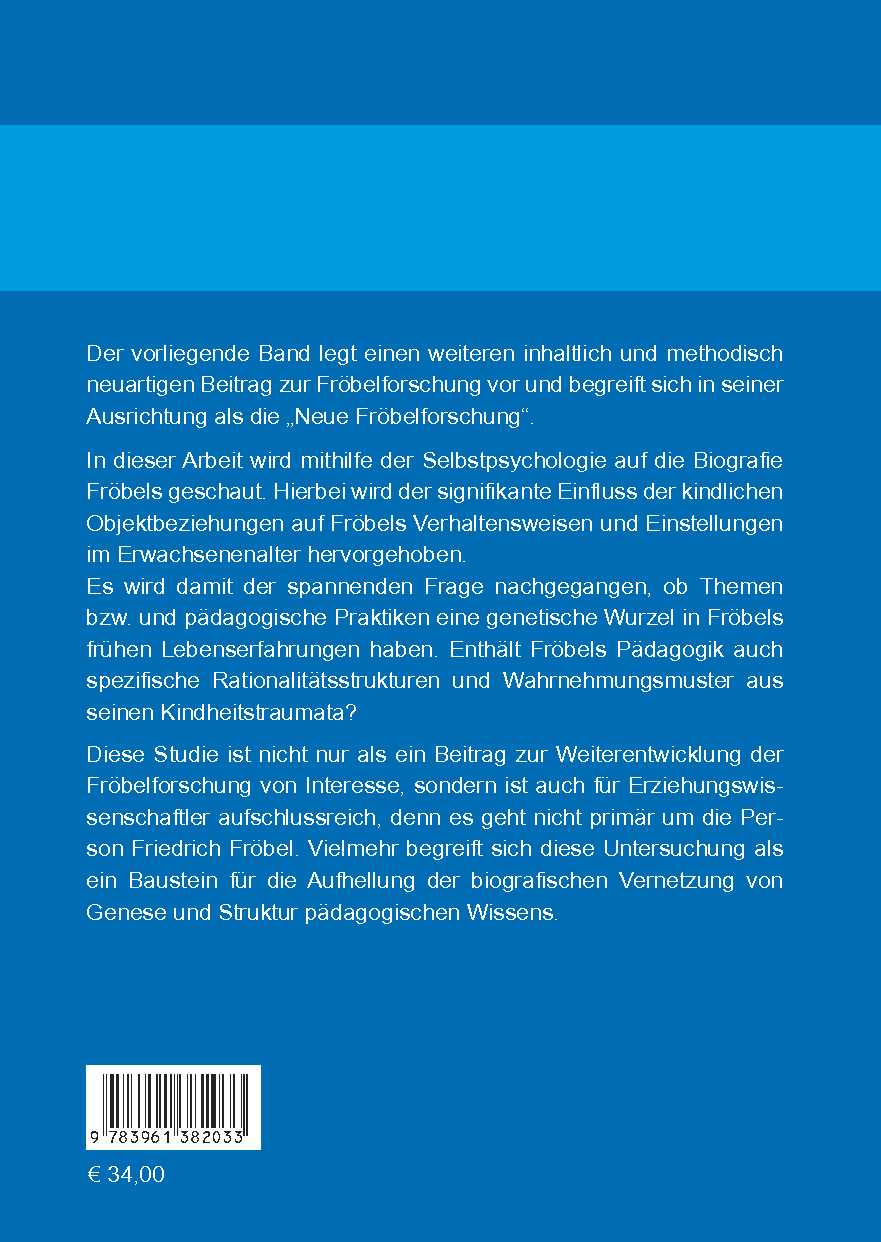 Diese Studie ist nicht nur als ein Beitrag zur Weiterentwicklung der Fröbelforschung von Interesse, sondern ist auch für Erziehungswissenschaftler aufschlussreich, denn es geht nicht primär um die Person Friedrich Fröbel. Vielmehr begreift sich diese Untersuchung als ein Baustein für die Aufhellung der biografischen Vernetzung von Genese und Struktur pädagogischen Wissens.