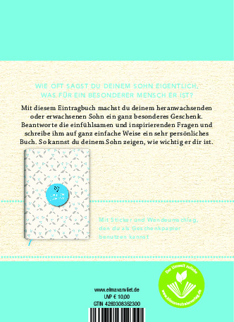 Halten Sie mithilfe der inspirierenden Fragen schöne Erinnerungen fest und schenken Sie Ihrem Sohn dieses Ausfüllbuch als sehr persönliches Geschenk.