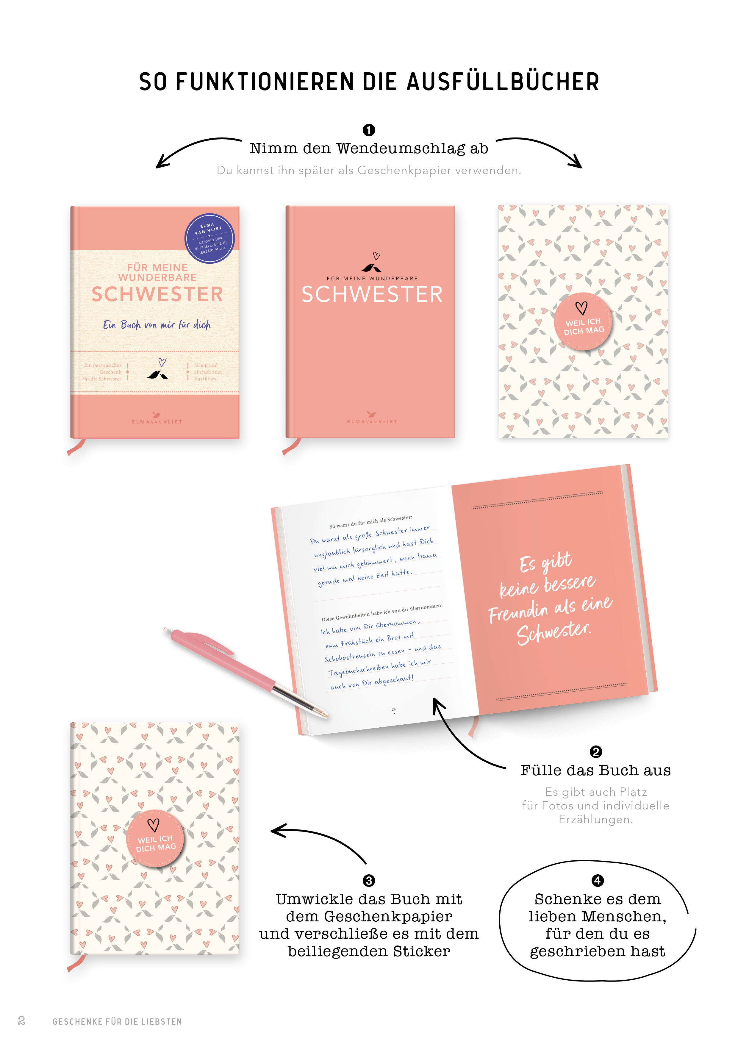 - Aufgeteilt in vier Themenblöcke: 1. Erinnerungen an früher, 2. Über die besondere Person, die du bist, 3. Warum du mir wichtig bist, 4. Wünsche und Träume für uns beide