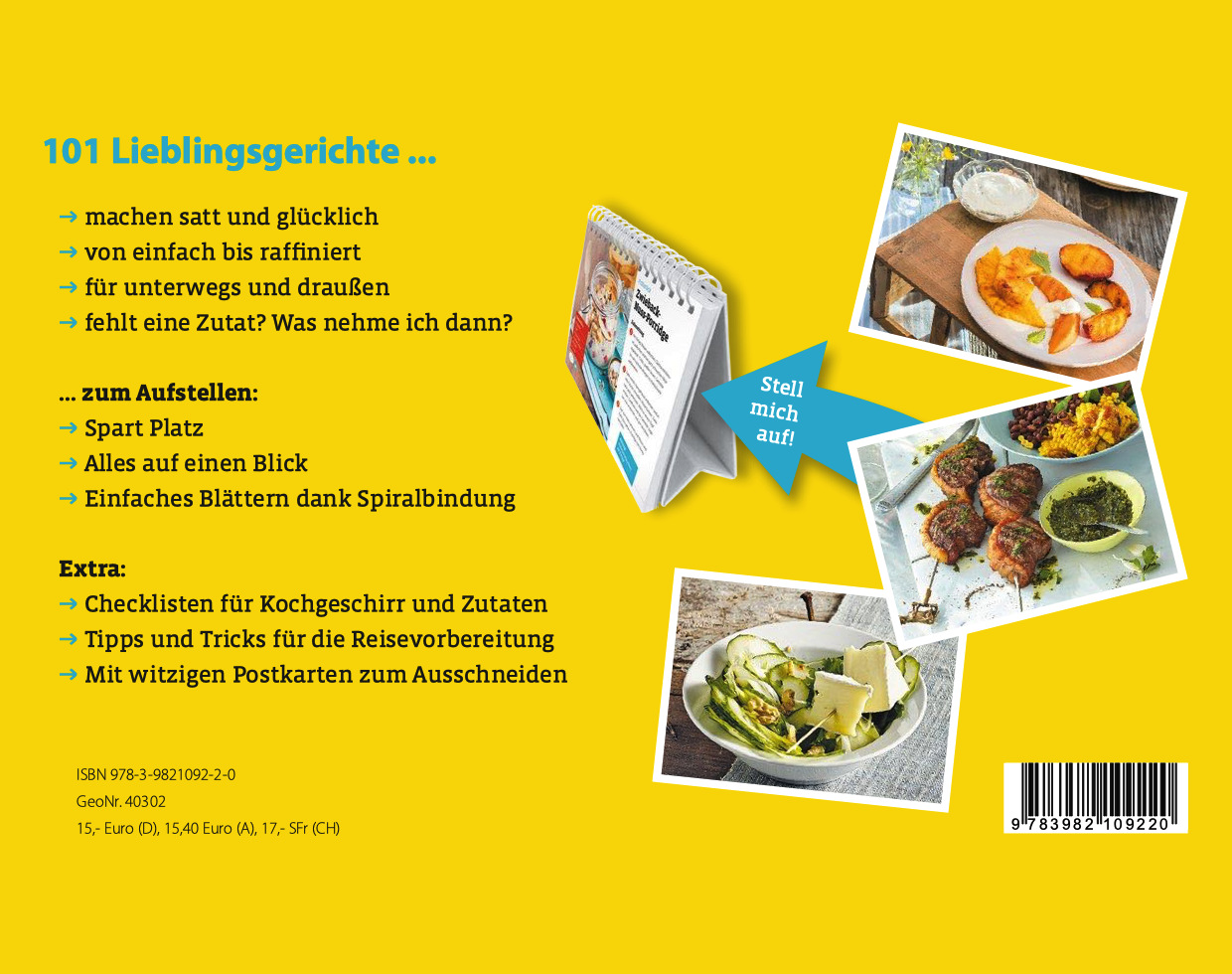 Das perfekte Kochbuch für Camping & Outdoor: zum Aufstellen und Umklappen dank Spiralbindung. Das spart Platz, ist einfach zu Blättern und hält das Lieblings-Rezept immer übersichtlich im Blick: Ein Rezept auf einer Seite!Mit 101 Lieblingsgerichten, lecker & leicht, aus nur wenigen Zutaten für fantasievolle Speisen, zubereitet auf maximal zwei Kochstellen.Alle Mengenangaben mit Hilfe von Bordmitteln: Löffel, Tasse, Messerspitze etc.Mein ideales Camping-Kochbuch ... mit dem Aufstelltrick!Plus kleines Extra: witzige Camper-Postkarten.Let's camp!Die Reihe von Campern für Camper.