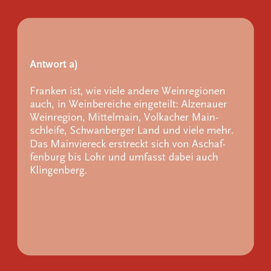 lt;p>Sie können unser reguläres Wein-Quiz bereits auswendig, haben aber noch lange nicht genug von ruhigen Sessel-Abenden oder geselligen Runden, in denen sich alles um Ihr Lieblingsgetränk dreht? Dann könnte das Frankenwein-Quiz die Lösung sein. Die Weinregion Franken hat nämlich einiges zu bieten. Zum Beispiel den Himmelstadter Kelter. Oder Lump, Bastel und Schwindel. Außerdem den Lappenbeutel. Oder Lumpenbeutel. Vielleicht ist es auch der Bocksbeutel so sehen jedenfalls die 66 Fragen aus, die Sie hier erwarten, drei mögliche Antworten gibt jeweils. Also entkorken Sie einen Silvaner und ergründen Sie das Weinwissen zwischen Abt-Degen-Weintal und Untereisenheim.