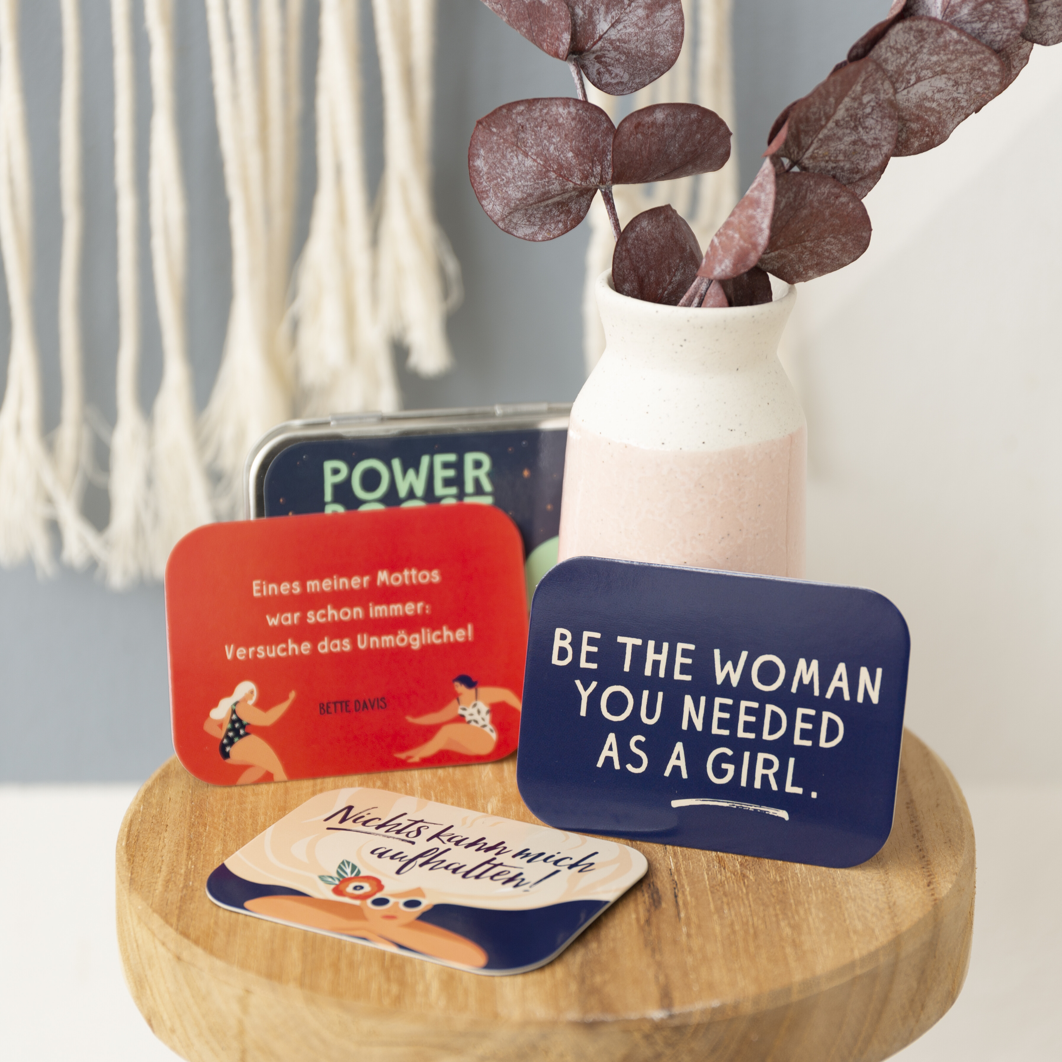 Die kleine Metallbox enthält 25 gestaltete Motivations-Karten mit kurzen Sprüchen, Aussagen oder Zitaten von berühmten Frauen. Die Metalldose ist klein und praktisch und kann in der Handtasche überall hin mitgenommen werden. So kannst du dir auch unterwegs, zum Beispiel auf dem Weg zur Arbeit, als kleines Morgenritual eine extra Portion Motivation verschaffen. Die Motivations-Karten sind auch ein tolles Geschenk für jede Powerfrau.