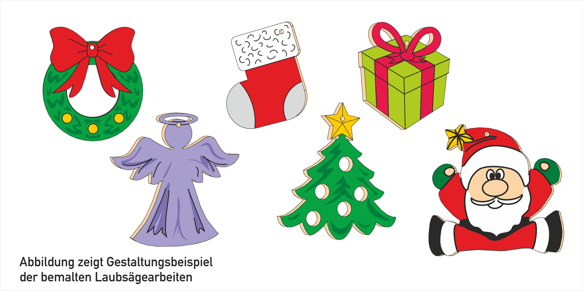 Laubsägevorlage für sechs verschiedene Weihnachtsbaumanhänger aus hochwertigem 3mm Pappelsperrholz