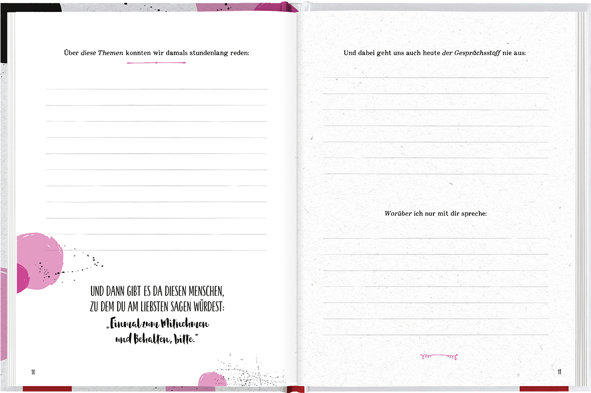 - In sieben Kapiteln kannst du alle gemeinsamen Erinnerungen festhalten; vom Beginn eurer Freundschaft bis hin zu den gemeinsamen Wünschen und Luftschlössern
