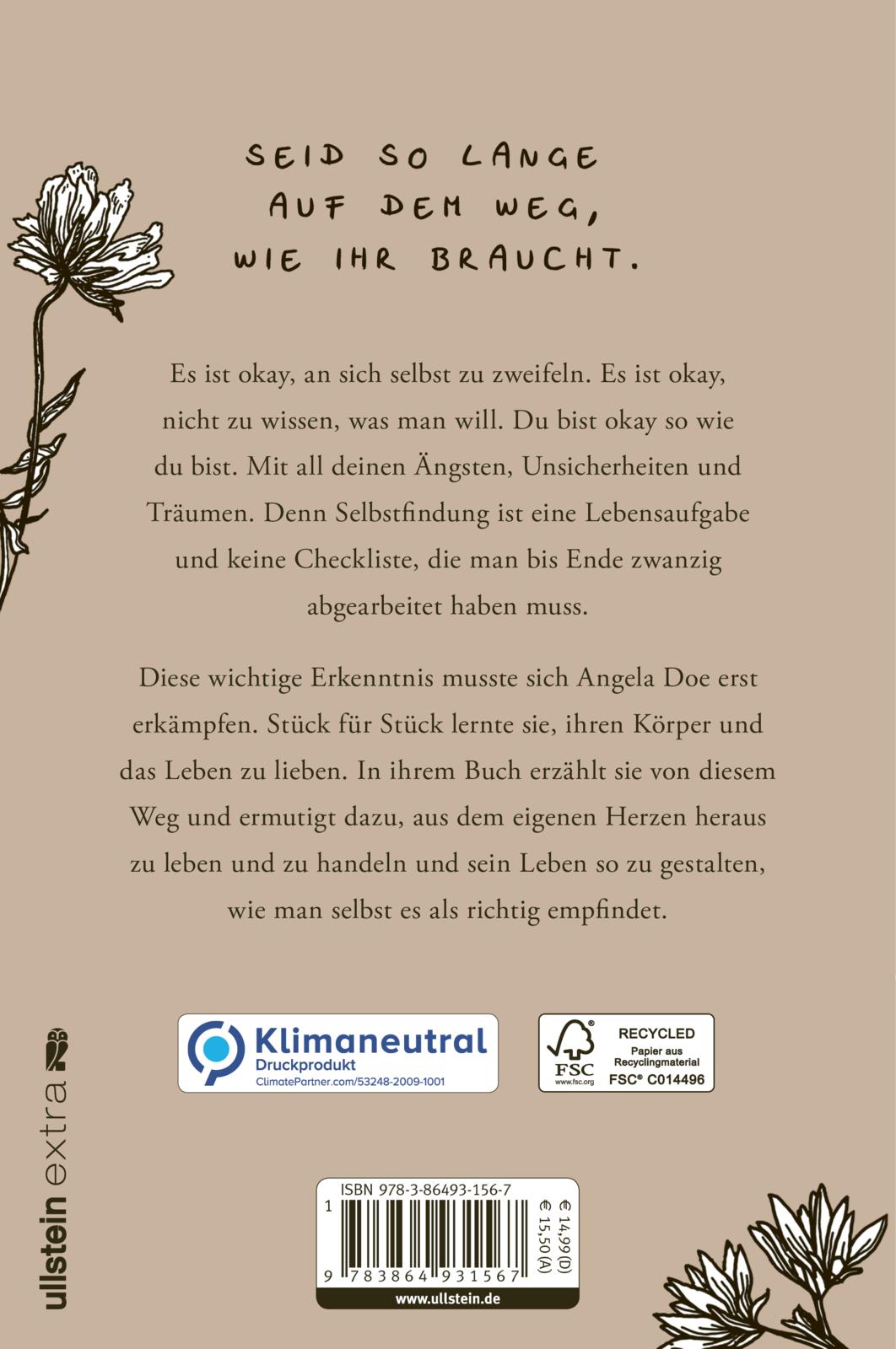 Es ist okay, an sich selbst zu zweifeln. Es ist okay, nicht zu wissen, was man will. Du bist okay so wie du bist. Mit all deinen Ängsten, Unsicherheiten und Träumen. Denn Selbstfindung ist eine Lebensaufgabe und keine Checkliste, die man bis Ende zwanzig abgearbeitet haben muss. Es gibt keine Fehler - nur Situationen, an denen wir rückblickend wachsen konnten. Diese wichtige Erkenntnis musste sich Angela Doe hart erkämpfen. Stück für Stück lernte sie, ihren Körper und das Leben zu lieben. Sie überwand ihre Essstörung, fand ihren Platz in dieser Welt und den Weg zu sich selbst.