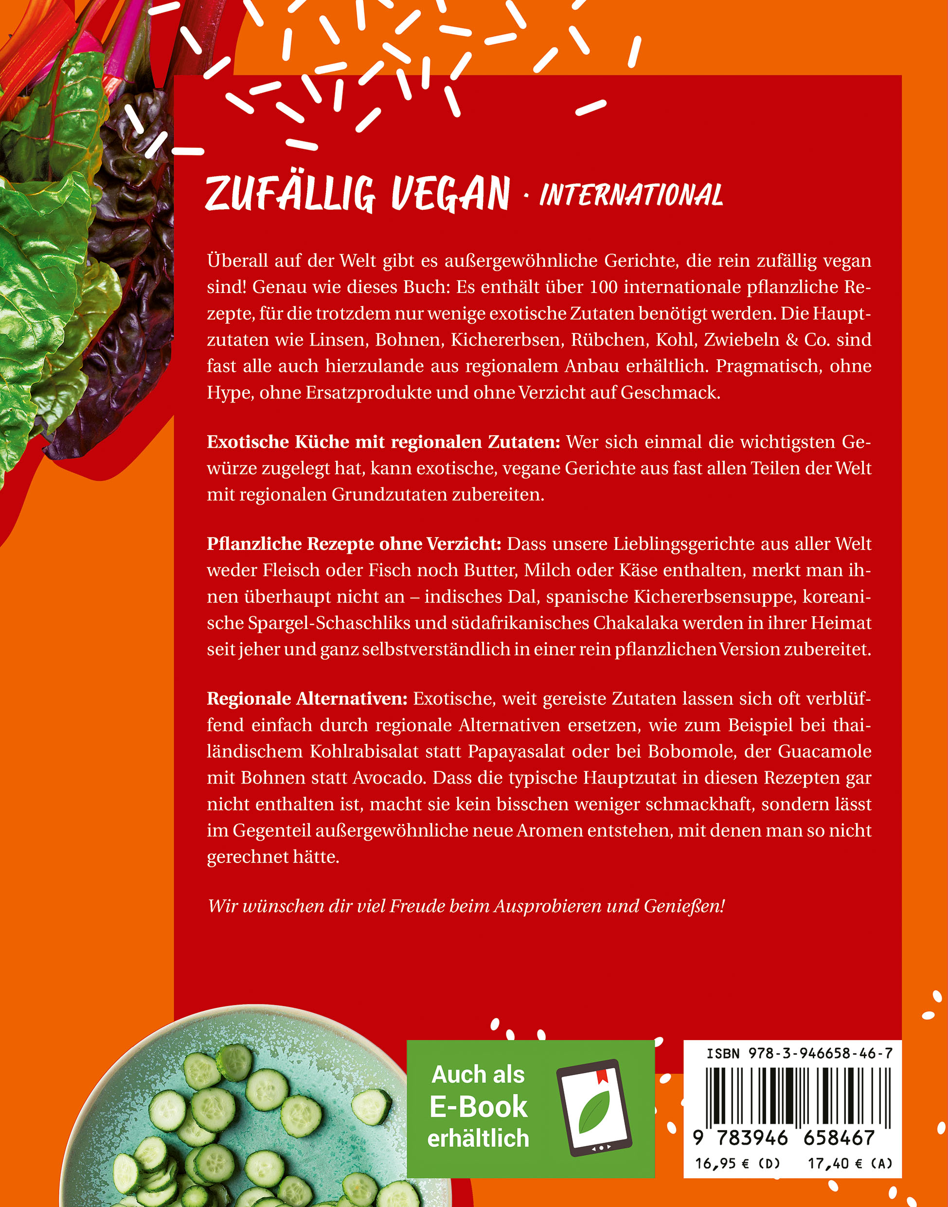 Überall auf der Welt gibt es außergewöhnliche Gerichte, die rein zufällig vegan sind! Genau wie dieses Buch: Es enthält über 100 internationale pflanzliche Rezepte, für die trotzdem nur wenige exotische Zutaten benötigt werden. Die Hauptzutaten wie Linsen, Bohnen, Kichererbsen, Rübchen, Kohl, Zwiebeln & Co. sind fast alle auch hierzulande aus regionalem Anbau erhältlich. Pragmatisch, ohne Hype, ohne Ersatzprodukte und ohne Verzicht auf Geschmack.Exotische Küche mit regionalen Zutaten: Wer sich einmal die wichtigsten Gewürze zugelegt hat, kann exotische, vegane Gerichte aus fast allen Teilen der Welt mit regionalen Grundzutaten zubereiten.Pflanzliche Rezepte ohne Verzicht: Dass unsere Lieblingsgerichte aus aller Welt weder Fleisch oder Fisch noch Butter, Milch oder Käse enthalten, merkt man ihnen überhaupt nicht an - indisches Dal, spanische Kichererbsensuppe, koreanische Spargel-Schaschliks und südafrikanisches Chakalaka werden in ihrer Heimat seit jeher und ganz selbstverständlich in einer rein pflanzlichen Version zubereitet.Regionale Alternativen: Exotische, weit gereiste Zutaten lassen sich oft verblüffend einfach durch regionale Alternativen ersetzen, wie zum Beispiel bei thailändischem Kohlrabisalat statt Papayasalat oder bei Bobomole, der Guacamole mit Bohnen statt Avocado. Dass die typische Hauptzutat in diesen Rezepten gar nicht enthalten ist, macht sie kein bisschen weniger schmackhaft, sondern lässt im Gegenteil außergewöhnliche neue Aromen entstehen, mit denen man so nicht gerechnet hätte.Wir wünschen dir viel Freude beim Ausprobieren und Genießen!