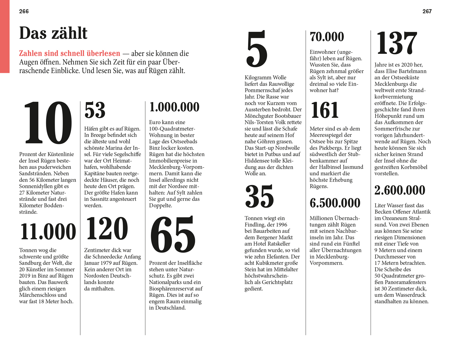 Senkrechtstarter, Überflieger, Querfeldein. Vor Ort - die Kapitel: Stralsund, Rügens Süden und das Inselzentrum, Rügens Osten und die Halbinsel Mönchgut, Rügens Norden und die Halbinsel Jasmund, Rügens Westen und die Insel Ummanz, Insel Hiddensee. Das Kleingedruckte (Reiseinfos von A bis Z). Das Magazin. Offene Fragen.