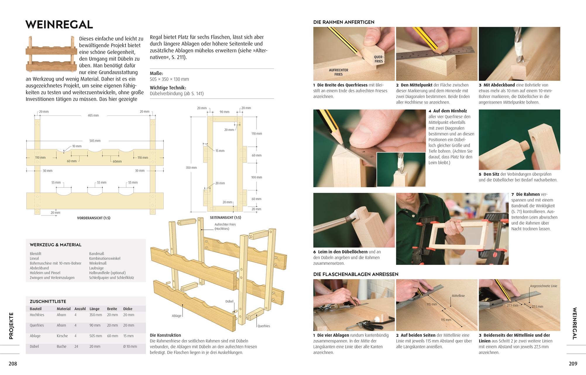 - Wichtigste Werkzeuge: Ob Stemmeisen, Hobel, Fräse oder Säge - alle notwendigen Werkzeuge, ihre Handhabung und Pflege werden anschaulich in kurzen Porträts vorgestellt.