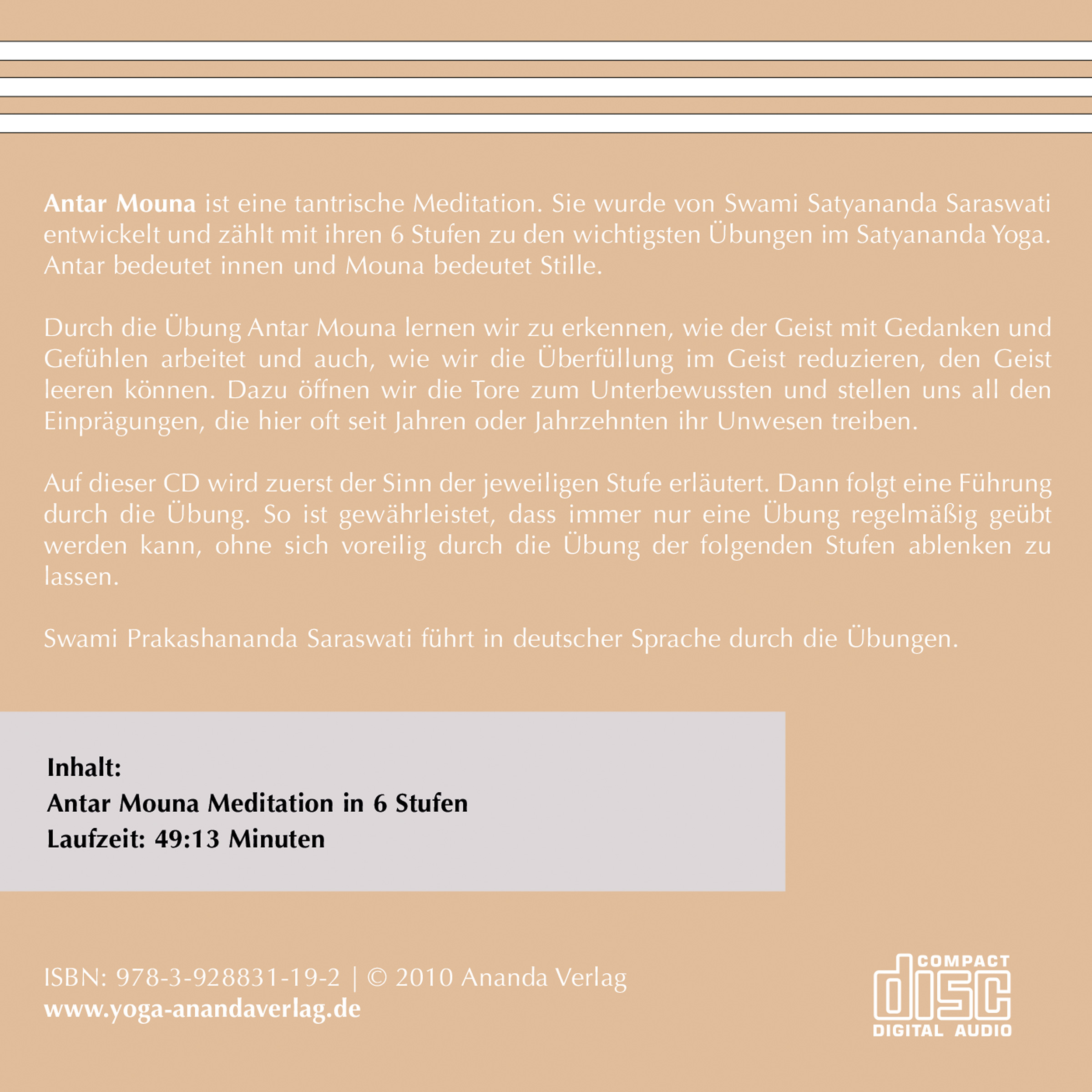 Durch die Übung Antar Mouna lernen wir zu erkennen, wie der Geist mit Gedanken und Gefühlen arbeitet und auch, wie wir die Überfüllung im Geist reduzieren, den Geist leeren können. Dazu öffnen wir die Tore zum Unterbewussten und stellen uns all den Einprägungen, die hier oft seit Jahren oder Jahrzehnten ihr Unwesen treiben.