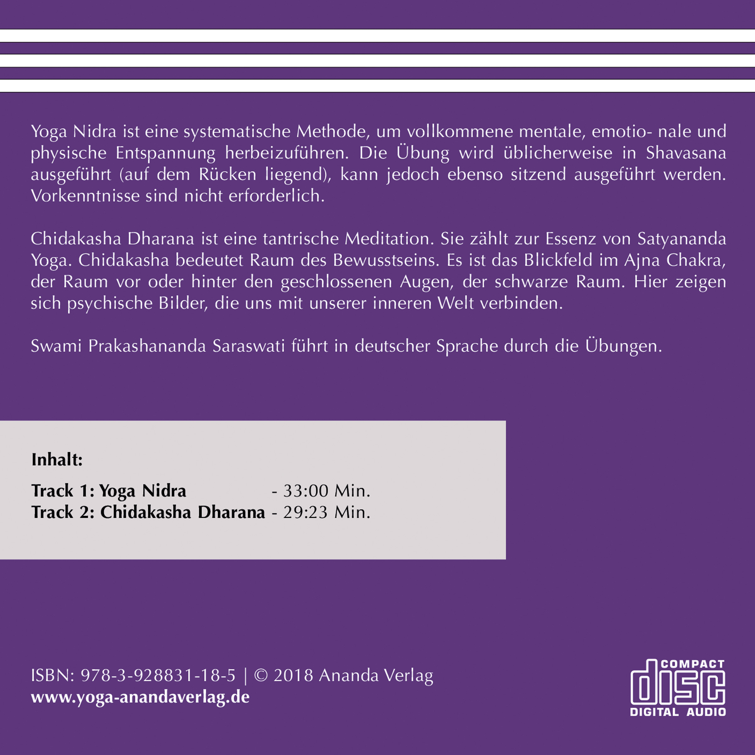 Swami Prakashananda Saraswati, geboren 1938 in Hannover, Deutschland, traf Swami Satyananda 1982 und wurde wenig später in Indien in Purna Sannyasa eingeweiht. 1984, kurz nach ihrer Rückkehr nach Deutschland, gründete sie am Bodensee das Satyananda Yoga Zentrum e.V. und begann mit den ersten Übersetzungen der Bücher der Bihar School of Yoga. 1985 gründete sie den Ananda Verlag. Mit ihr wurden zahlreiche CDs aufgenommen und sie gab die Lehre ihres Gurus in authentischer Weise weiter. Bis zu ihrem Todestag, den 16.11.2020, lebte und arbeitete sie in Ratzeburg.
