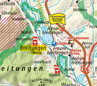 Wer sich über Freizeitangebote in der Rhön informieren möchte, trifft mit dem Erlebnisführer Rhön eine gute Wahl. Zahlreiche Fähnchen im Kartenteil geben als Symbol stichwortartig Auskunft über naturverbundene Attraktionen wie Tierparks, Gleitschirmschulen, Rodelarena oder Planwagenfahrten. Aber auch kulturelle Angebote wie Museen und Kirchen gerade auch in der Stadt Fulda wollen Besucher anlocken. Auf der Rückseite der Karte gibt es nähere Infos zu all diesen Zielen und Orten der Rhön.