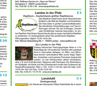 Der Erlebnisführer Pfalz zeigt: Ein Besuch in der Region rund um Kaiserslautern lohnt sich! Viele Ausflugsziele - vom Bergbaumuseum in Bexbach über die Bärenhöhle bei Rotalben bis zum Zoo in Landau - sind markiert. Der geschichtsträchtigen und naturgeprägten Region des Pfälzer Waldes entsprechen zahlreiche Burgen und naturbezogene Attraktionen. Näheres zu diesen und anderen Ausflugstipps - auch entlang des Rheins von Worms bis Karlsruhe - erfährt man auf der Kartenrückseite.