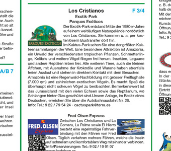 Der Erlebnisführer informiert umfangreich über lohnenswerte Ziele auf Teneriffa: Museumsbesuche, Ausflugstipps, Hinweise auf Tauchstationen u. Golfplätze, Beschreibung des Nationalparks (u.a.). Ferner wird ein Wanderweg zum Teide (3.718 m ü. NN) beschrieben, dem Vulkanberg im Zentrum der Insel. Detaillierte Stadtpläne von Puerto de la Cruz, Los Christianos, Santa Cruz u. La Laguna helfen, sich schnell in den größeren Orten zu orientieren.