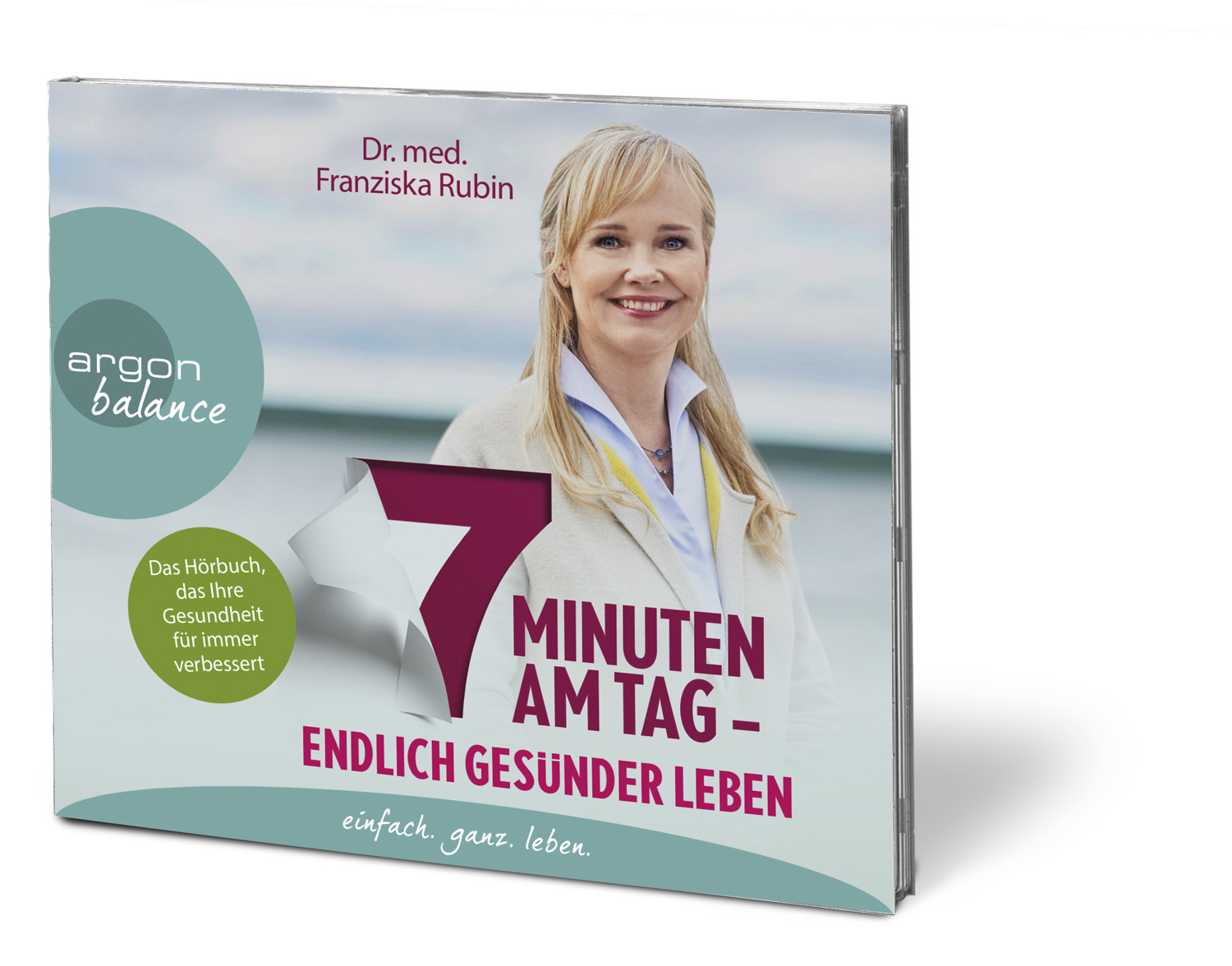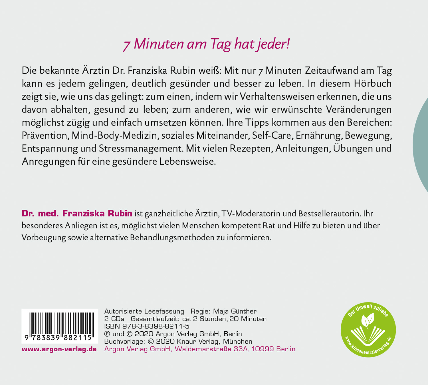 Die bekannte Ärztin Dr. Franziska Rubin weiß: Mit nur 7 Minuten Zeitaufwand am Tag kann es jedem gelingen, deutlich gesünder und besser zu leben. In ihrem ersten Hörbuch zeigt sie, wie uns das gelingt: zum einen, indem wir Verhaltensweisen erkennen, die uns davon abhalten, gesund zu leben; zum anderen, wie wir erwünschte Veränderungen möglichst zügig und einfach umsetzen können. Ihre Tipps kommen aus den Bereichen: Prävention, Mind-Body-Medizin, soziales Miteinander, Self-Care, Ernährung, Bewegung, Entspannung und Stressmanagement. Mit vielen Rezepten, Anleitungen, Übungen und Anregungen für eine gesündere Lebensweise.