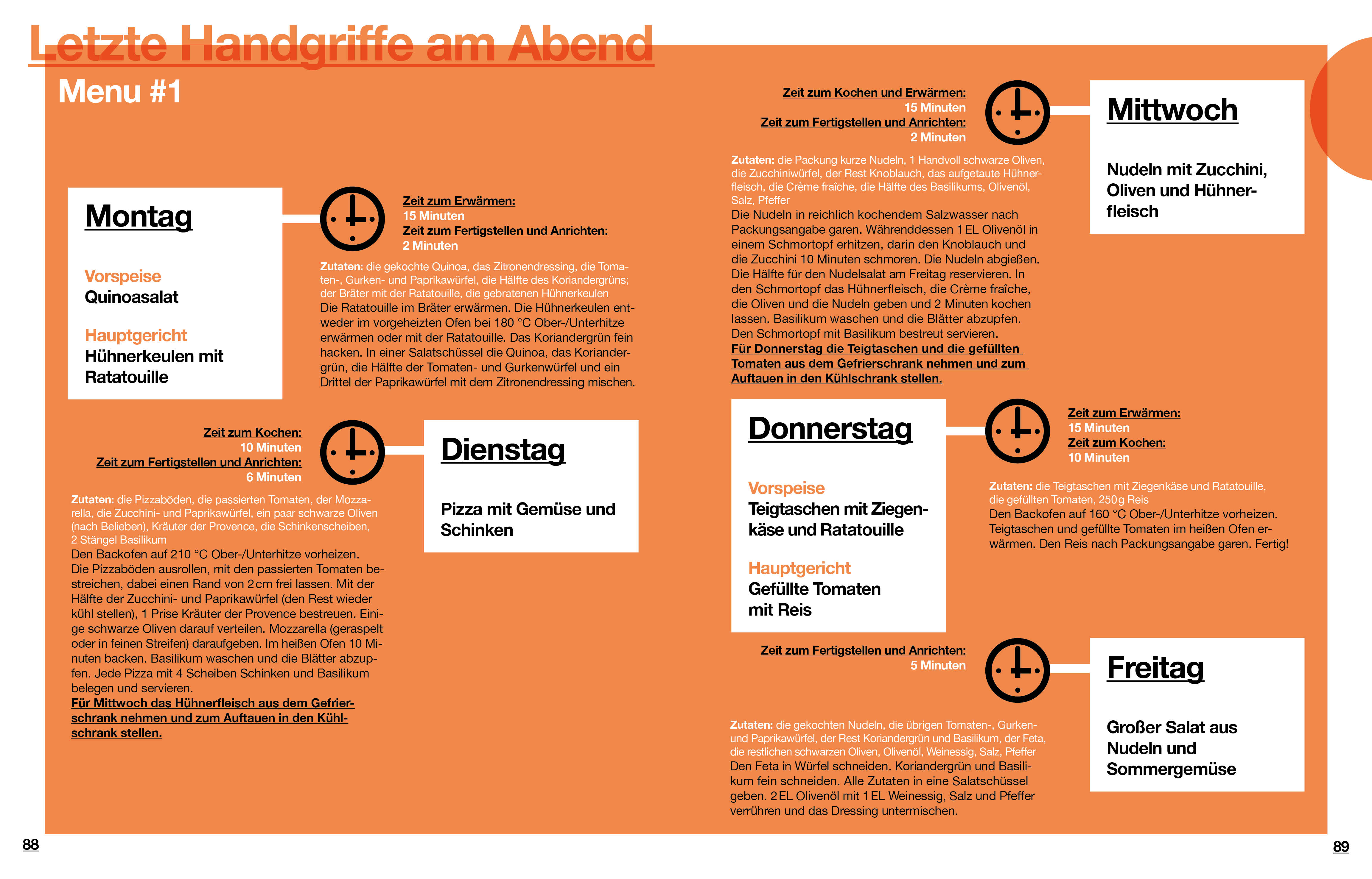 Der Klügere kocht vor. Die wichtigste Waffe in der Küche ist die Vorratsdose: Mit nur 2 Stunden Vorkochen am Wochenende kann jeder die ganze Woche Selbstgekochtes genießen. Caroline Pessin präsentiert Meal Prep in seiner schönsten Form. Die Wochenpläne mit insgesamt 111 saisonalen Gerichte mit einem Hauch französischer Haute Cuisine - darunter Kichererbsenburger, Teigtaschen mit Ziegenkäse, Ochsenbäckchen und Fischfrikassee - sind so strukturiert, dass der Einkauf und die Menüplanung unkompliziert und stressfrei ist. Am Wochenende werden die Gerichte vorbereitet, pro Tag gibt es dann nur noch die Hinweise zur Finalisierung und was wann aufgetaut werden muss. So spart man Geld und Nerven und hat mehr Zeit für die schönen Dinge im Leben.