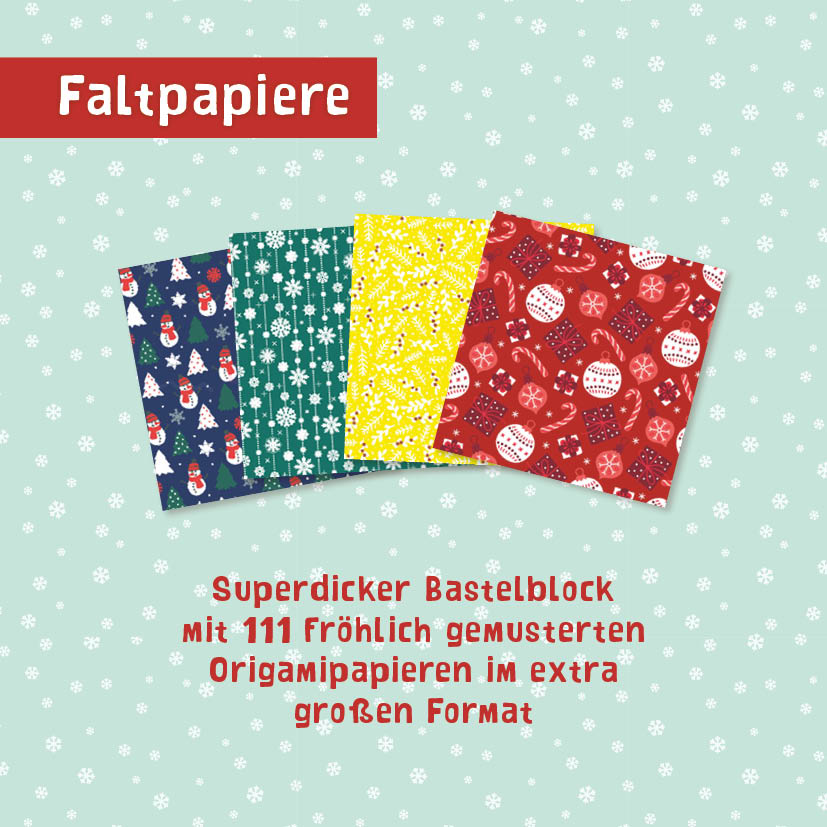 Großer Weihnachts-Origamispaß für kleine Faltkünstler! Mit 111 weihnachtlichen Origamipapieren und kinderleichten Schritt-für-Schritt-Anleitungen für Kinder ab 5 Jahren entstehen im Handumdrehen viele weihnachtliche Projekte. So wird spielend einfach die Feinmotorik der kleinen Origami-Künstler geübt und das Erfolgserlebnis stellt sich dank des kindgerechten Großformats schnell ein. Das Papier hat die typische Origamipapiergrammatur und ist mit weihnachtlichen Mustern für Kinder ausgestattet.
