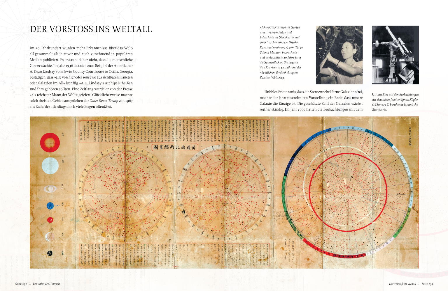 Der Atlas des Himmels versammelt die schönsten Karten, die der Mensch bei der Vermessung des Himmels geschaffen hat; eine reich bebilderte Schatzkammer der Himmelskartographie. Ergänzt werden die astronomischen Karten durch mittelalterliche Manuskripte, Meisterwerke der Kunst, alte Sternenkataloge, antike Instrumente und andere Kuriositäten. Wir tauchen ein in das Reich der Sterne und Planeten, wie es garantiert noch nie zuvor zu sehen war: ein Reich voller Götter, Teufel und Wetterzauberer, in dem wir fliegenden Seeleuten, Außerirdischen, mythologischen Tieren und wütenden Geistern begegnen.