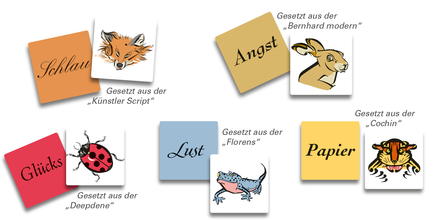 jeweils in derselben Schrift gesetzt, in der das Tier "gezeichnet" ist, so dass es sich um lupenreine