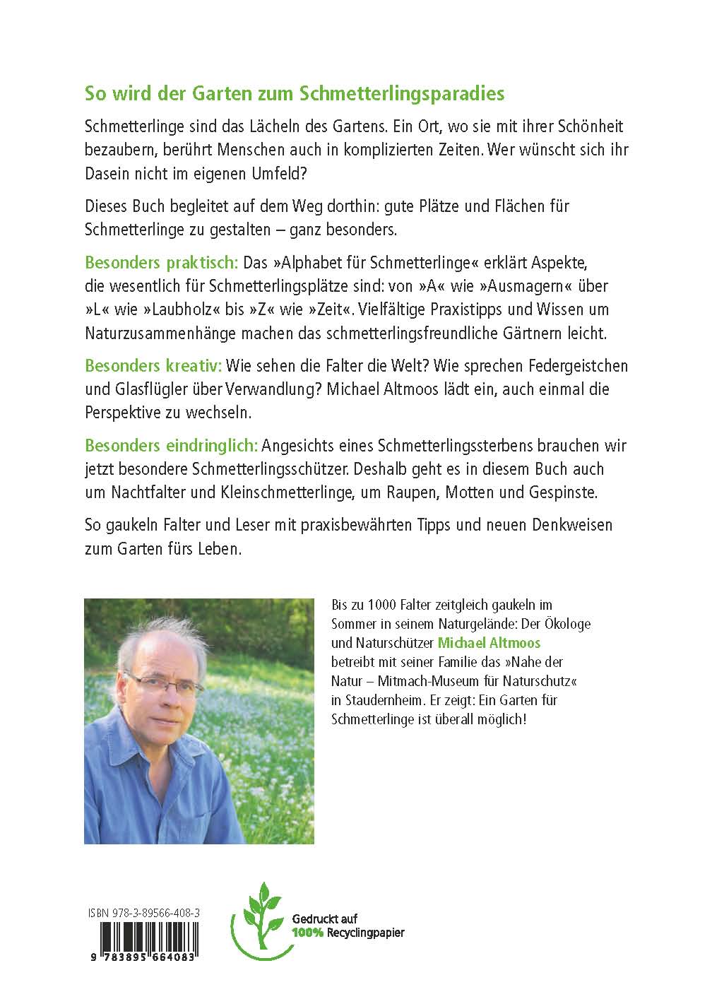 Besonders praktisch: Das »Alphabet für Falter« erklärt Aspekte, die wesentlich für Schmetterlingsplätze sind: von A wie »Ausmagerung« über L wie »Laubholz« bis Z wie »Zeit«. Vielfältige Praxistipps und Wissen um Naturzusammenhänge machen das schmetterlingsfreundliche Gärtnern leicht.