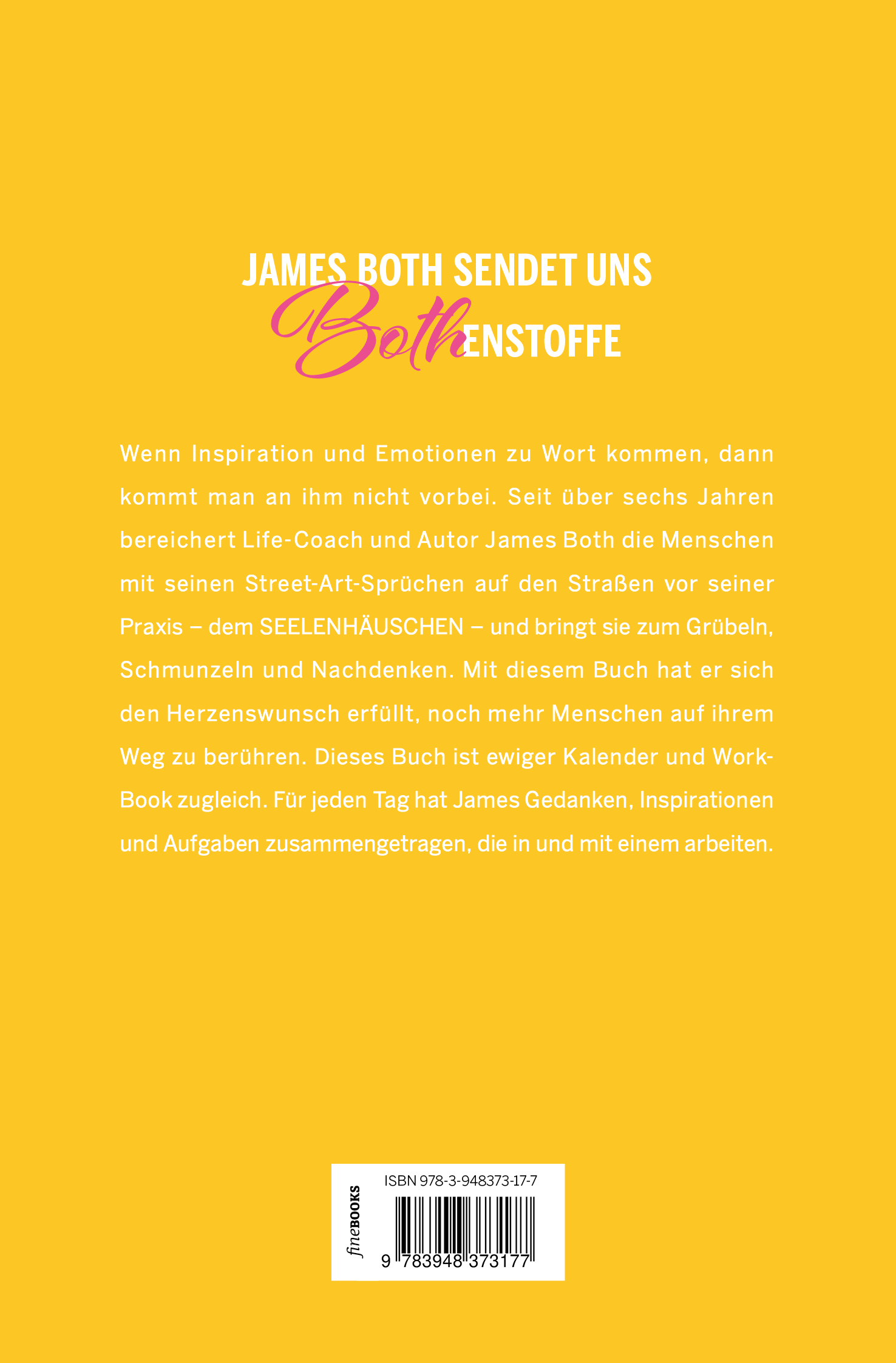 James Both wurde 1981 in Frankfurt am Main geboren. Seit 2012 geht er seiner Berufung als Life-Coach nach. In diesem Jahr gründetet er auch seine Praxis – das SEELENHÄUSCHEN (www.seelenhaeuschen.de). Bis heute praktiziert er in seiner Praxis als Coach im Rhein-Main-Gebiet. Er hält Vorträge, gibt Seminare und unterstützt die Menschen auf ihrem Weg zu mehr Lebensfreude und Lebensqualität. James studierte Sprach- und Kommunikationswissenschaften, sowie Literaturwissenschaften an der RWTH Aachen. Im Anschluß absolvierte er eine Ausbildung an der renommierten Texterschmiede e.V. in Hamburg und arbeitete danach als Werbetexter in großen Agenturen in Hamburg, Düsseldorf und Aachen. Kontaktmöglichkeit und weitere Infos über James: www.mein-life-coach.de