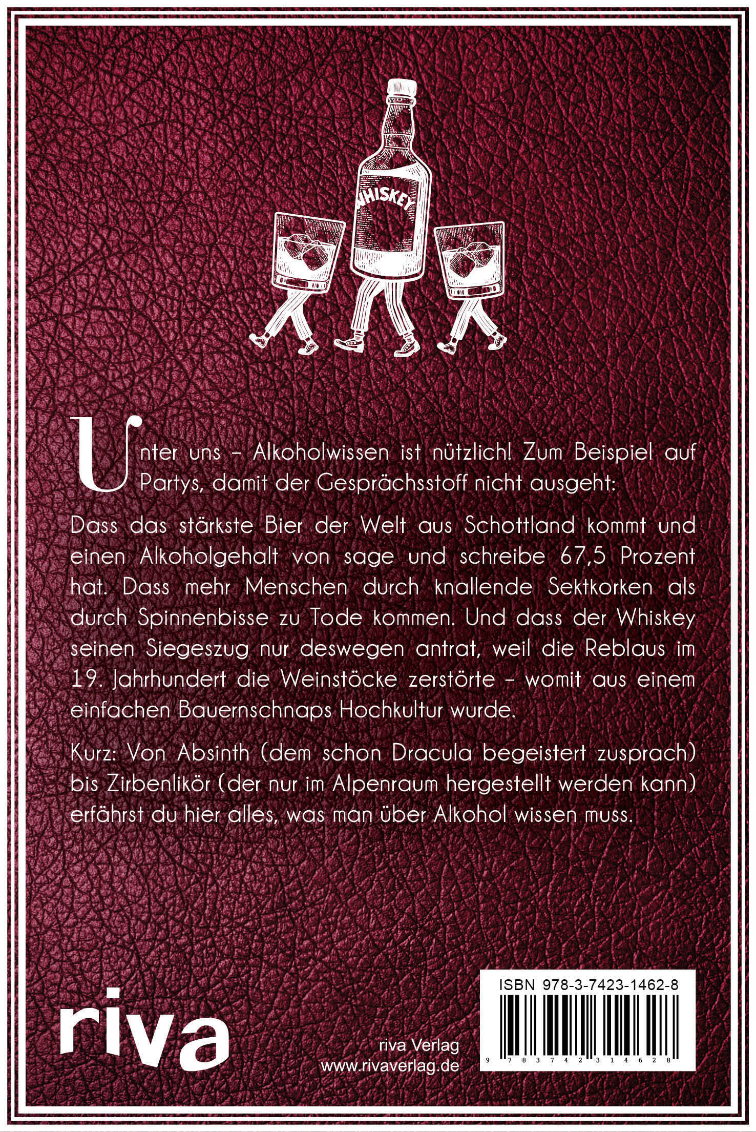Unter uns - Alkoholwissen ist nützlich! Zum Beispiel auf Partys, damit der Gesprächsstoff nicht ausgeht: Dass das stärkste Bier der Welt aus Schottland kommt und einen Alkoholgehalt von sage und schreibe 67,5 Prozent hat. Dass mehr Menschen durch knallende Sektkorken als durch Spinnenbisse zu Tode kommen. Und dass der Whiskey seinen Siegeszug nur deswegen antrat, weil die Reblaus im 19. Jahrhundert die Weinstöcke zerstörte - womit aus einem einfachen Bauernschnaps Hochkultur wurde. Kurz: Von Absinth (dem schon Dracula begeistert zusprach) bis Zirbenlikör (der nur im Alpenraum hergestellt werden kann) erfährst du hier alles, was man über Alkohol wissen muss.