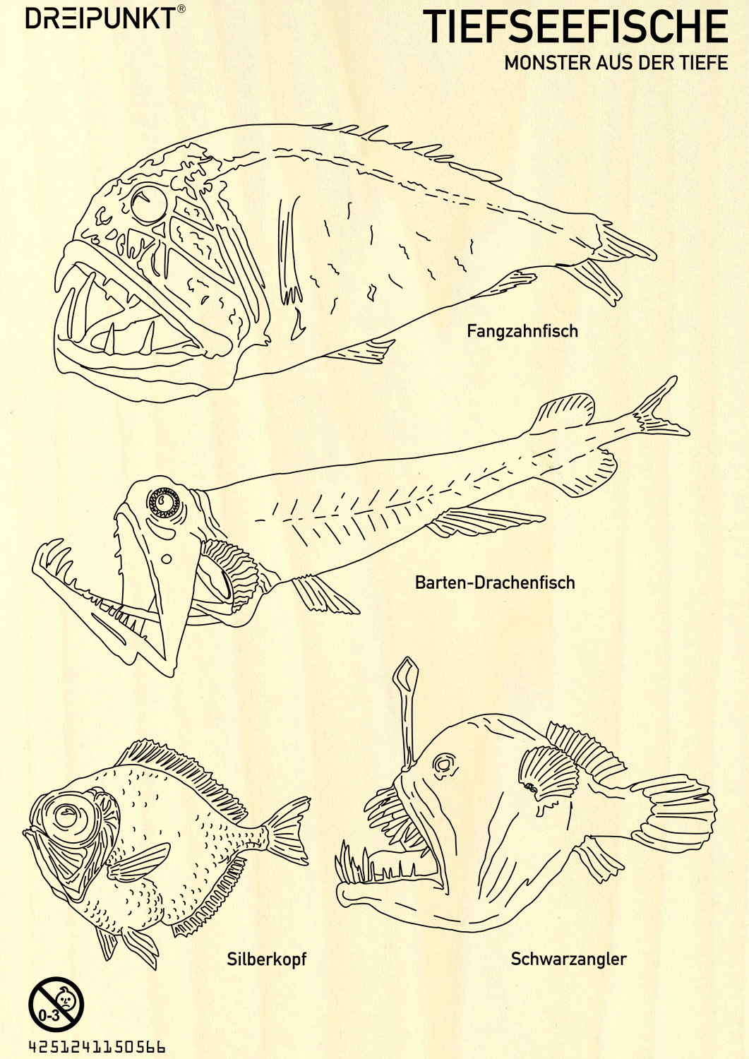 Faszinierende Modelle von vier verschiedenen Tiefseefischen. Die detailliert ausgearbeiteten Modelle können auch zum Bau eines Mobiles genutzt werden. Farbenfroh angemalt sind sie ein toller Schmuck für das Kinderzimmer - mit einer leichten Beize versehen, vermitteln sie den Eindruck eines wissenschaftlichen Modells. So ist für jeden Geschmack etwas dabei! Laubsägearbeiten bieten nicht nur stundenlangen Bastelspaß, sie fördern auch die Entwicklung des Kindes in den Bereichen Konzentration und motorische Fähigkeiten. Packungsinhalt: - Laubsägevorlage aus 3mm Pappelsperrholz - Bild der fertigen Modelle - Allgemeine Tipps und Hinweise zu Laubsägearbeiten - eMail-Link an den Support für Fragen, die beim Bau auftreten können Ob für dich selbst oder für deine Kinder oder Enkel: Genieße ein tolles Hobby mit hochwertigen Laubsägevorlagen aus dem Hause DREIPUNKT®!