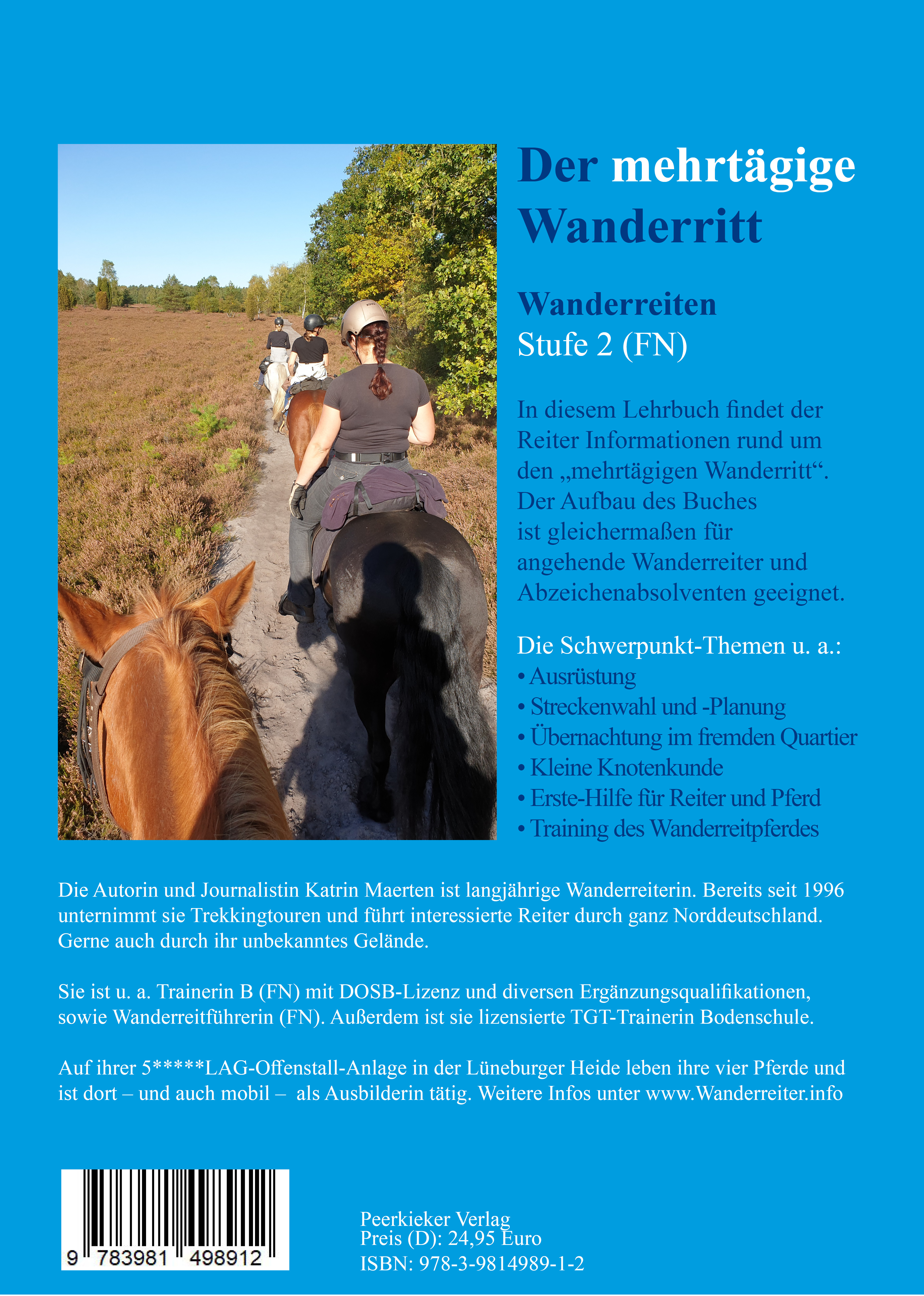 Lehrbuch zur Vorbereitung und Prüfung zum AbzeichenWanderreiten Stufe 2 (FN)Mit diesem Lehrbuch erhält der angehende Wanderreiter Informationen für den „mehrtägigen Wanderritt“ an die Hand.Es ist so aufgebaut, dass das Abzeichenwissen komprimiert aufbereitet ist. Aber auch wer keine Prüfung machen möchte, findet viele Tipps und Informationen für den Wanderritt.Die Schwerpunkte beim mehrtägigen Wanderritt:• Ausrüstung• Streckenwahl und -Planung• Übernachtung im fremden Quartier• Kleine Knotenkunde• Die Natur – der Lebensraum des Pferdes• Erste-Hilfe für Reiter und Pferd• Training des Wanderreitpferdes